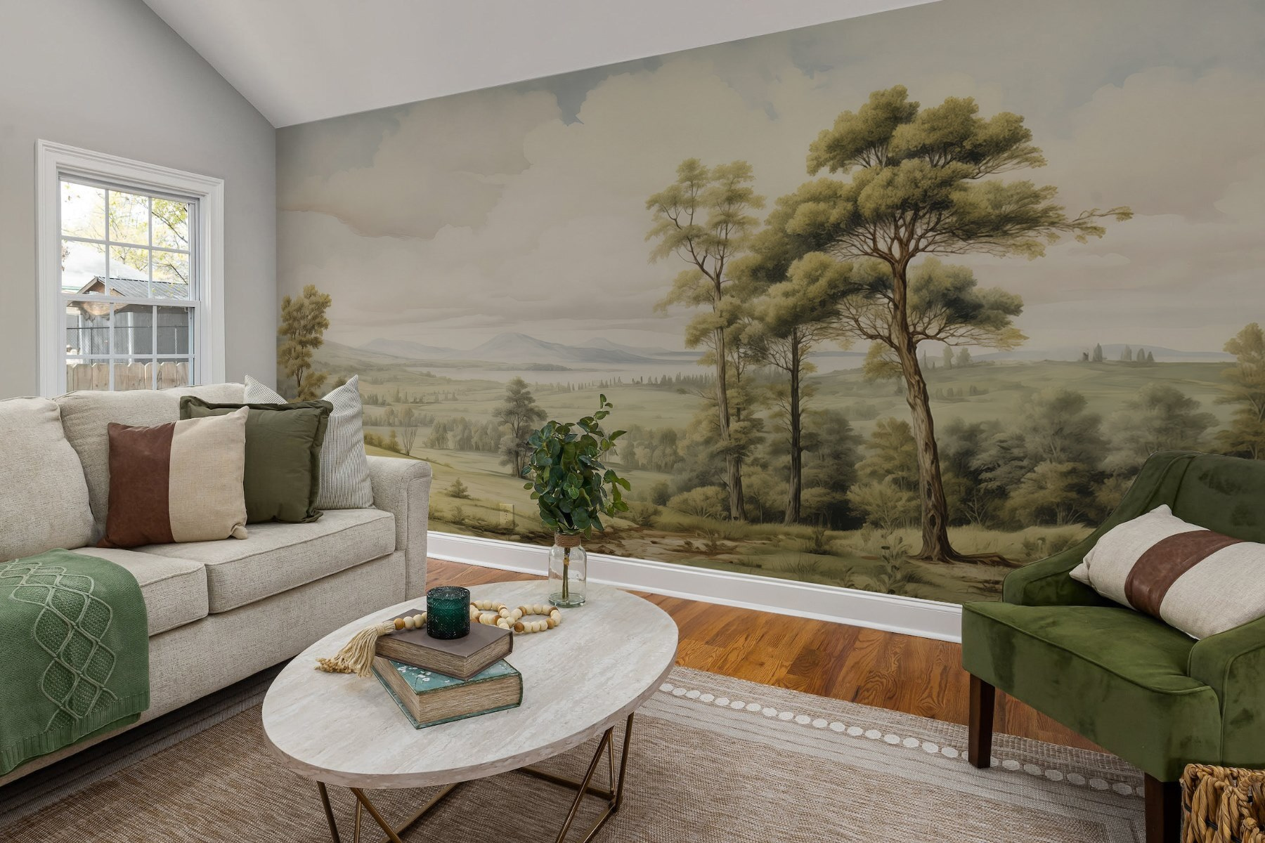 Transform your space with this stunning wall mural, “Landscape with Trees and Hills.” Imagine stepping into a serene landscape, where gentle hills meet towering trees—just what a room needs for that touch of nature. It’s like bringing the outdoors inside without worrying about watering plants or pesky bugs. Picture a cozy reading nook where this mural sets the perfect backdrop, or maybe a dining area that feels like an elegant picnic. The soft colors soothe while sparking chatter. Friends might even ask if they can move in. It’s décor that invites dreams and stories—who doesn’t love that? Get ready to breathe new life into your walls!