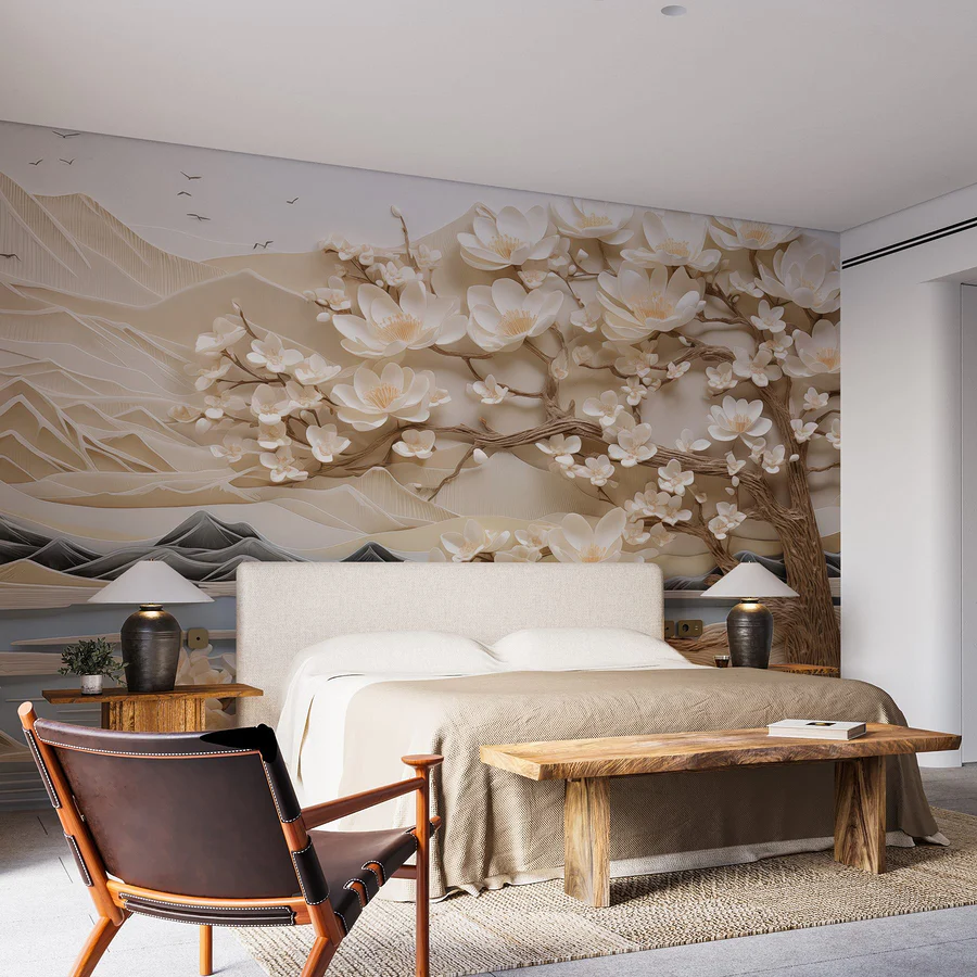 Transform your space with this enchanting wall mural of a tree adorned with delicate white flowers set against a backdrop of majestic mountains. It’s like bringing a slice of nature right indoors, minus the messy gardening. Imagine waking up to this serene scene, where the soft colors whisper tranquility and a hint of mystery. The petals seem to dance in the breeze, inviting daydreams and peaceful moments. It’s perfect for any room craving a touch of elegance, whether it’s a cozy nook or a lively living area. Just picture a cup of tea in hand, gazing at those mountains, feeling like you’ve entered a tranquil Japanese garden, all within your own walls. Now that’s the kind of decor that makes you smile!