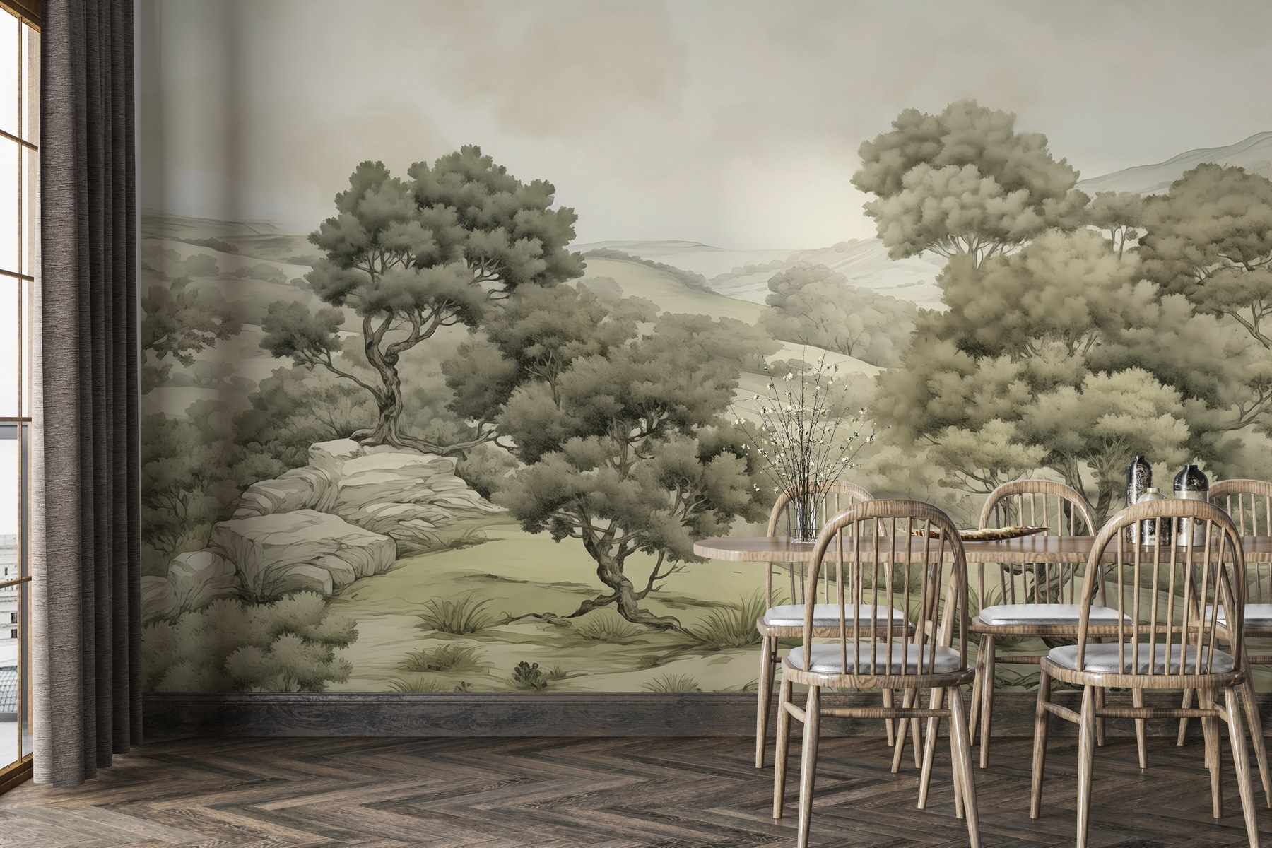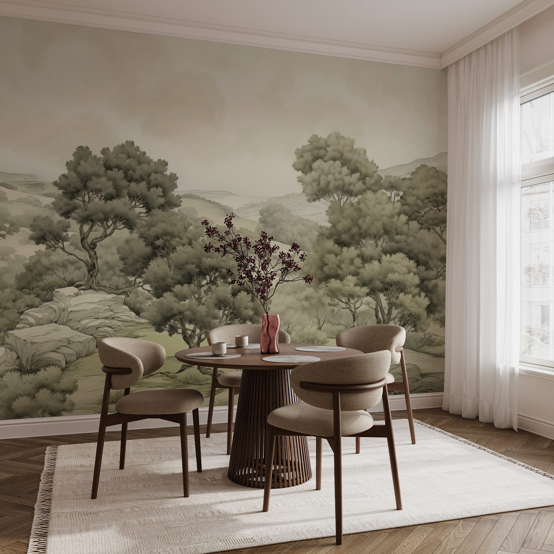 Trasforma il tuo spazio in un rifugio tranquillo con questo splendido murale “Paesaggio con alberi e rocce”. Immagina di svegliarti ogni mattina con la sensazione di entrare in una foresta serena: che sensazione rinfrescante! I toni morbidi e tenui evocano un senso di calma, rendendolo perfetto per soggiorni o angoli accoglienti. È come portare un piccolo pezzo di natura in casa senza preoccuparsi che fastidiosi insetti o il tempo rovinino l’atmosfera.