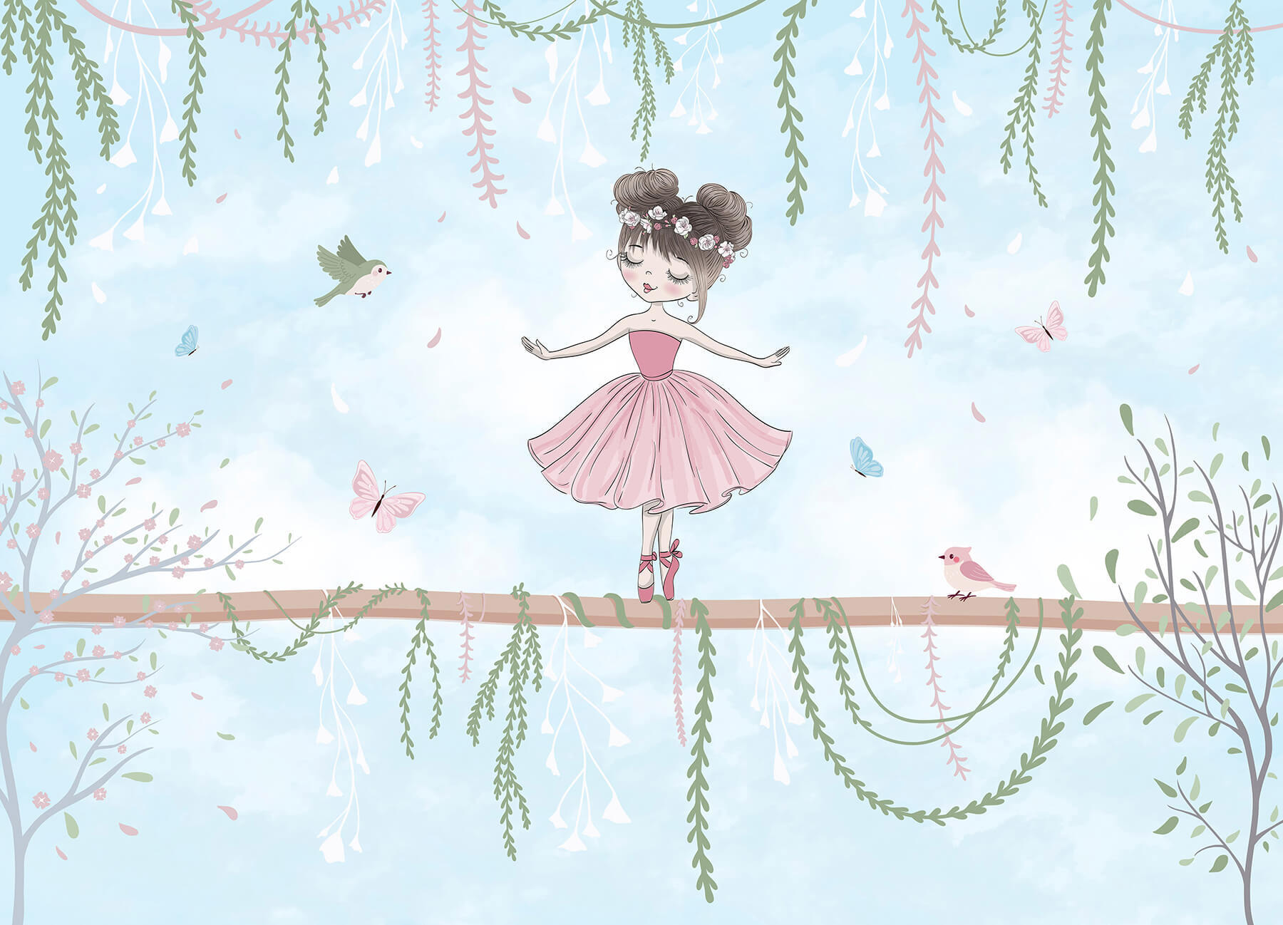 Entra in un mondo da sogno con questo incantevole murale che raffigura un’affascinante ragazza in un vestito rosa, perfettamente in equilibrio su un ramo. Circondata da farfalle svolazzanti e uccellini giocherelloni, sembra una scena uscita da una deliziosa fiaba. Immagina come potrebbe rallegrare un accogliente angolo lettura o portare gioia nella cameretta di un bambino. I colori tenui e i dettagli stravaganti invitano al sorriso, rendendo ogni sguardo simile a un caldo abbraccio. Immagina di sorseggiare un tè, ammirando la sua grazia e perdendoti nelle storie che lei ispira: chi non lo vorrebbe? Questo murale non è solo un elemento decorativo, è una fuga magica!