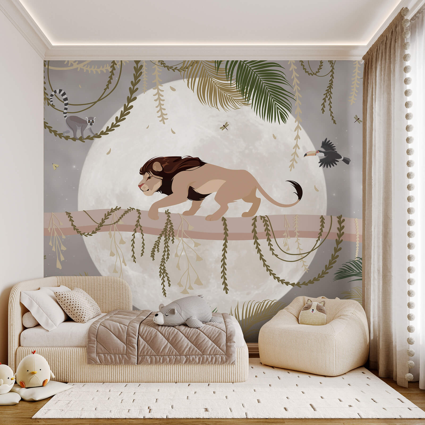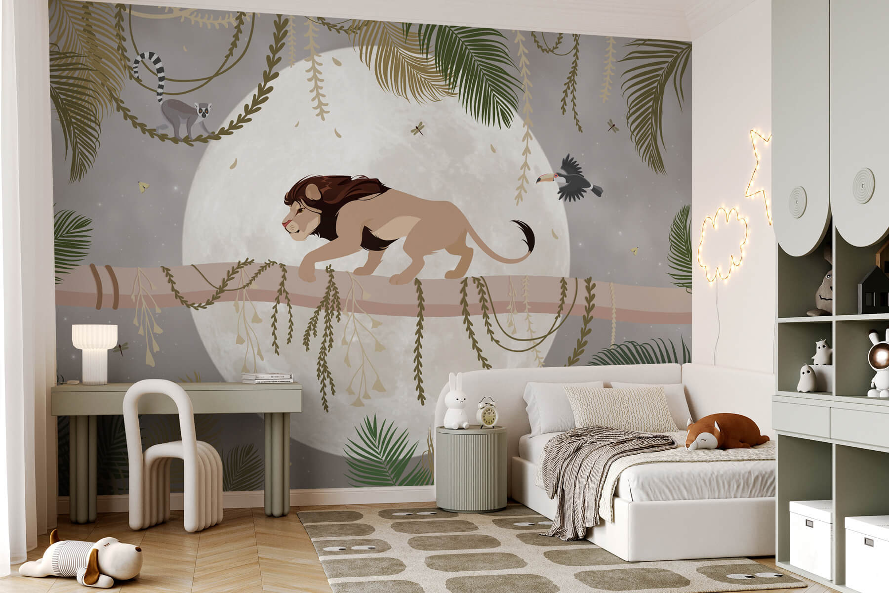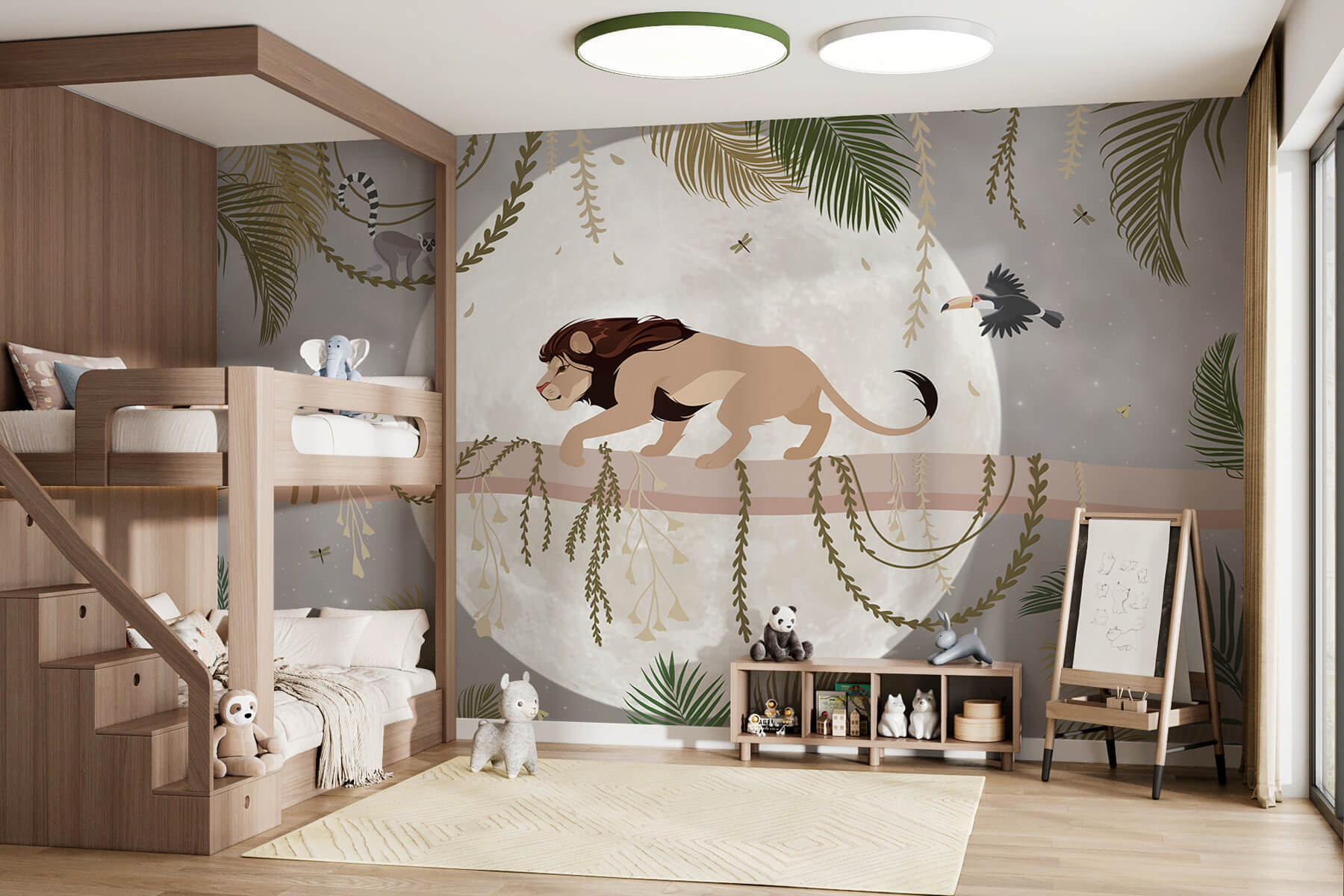 Vi presentiamo un murale che racchiude tutto il fascino selvaggio: ecco a voi “Lion on a Tree Branch” (Leone su un ramo). Immaginate questa maestosa creatura che cammina con sicurezza su un ramo, incorniciata da foglie ondeggianti e da una luna da sogno. È come portare un pezzo di tropici direttamente nel vostro salotto. Ogni sguardo regala un tocco di avventura, non credete?