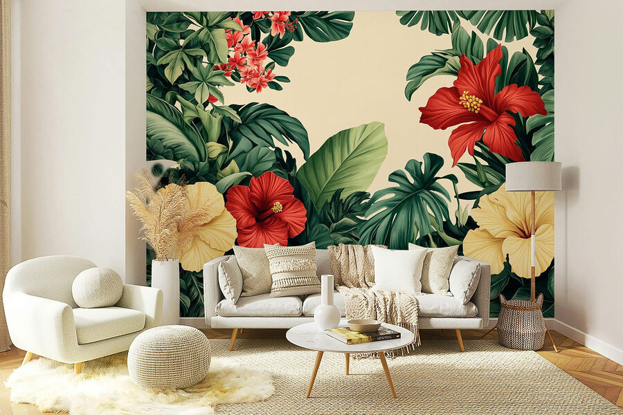 Trasforma qualsiasi stanza in un rifugio tropicale con questo splendido murale che raffigura un vivace gruppo di fiori e foglie rigogliose. Immagina di entrare nel tuo spazio e di essere accolto da audaci fiori di ibisco e verdi intensi. È come una mini vacanza direttamente a casa tua! Questo murale non solo aggiunge colore, ma anche un tocco di vivacità, perfetto per illuminare il tuo salotto o per invitare un tocco di natura in un accogliente angolo lettura. Immagina di sorseggiare un drink mentre ti godi questa bellezza botanica: pura felicità! Perfetto per chiunque desideri un tocco di fascino naturale senza dover innaffiare nulla.