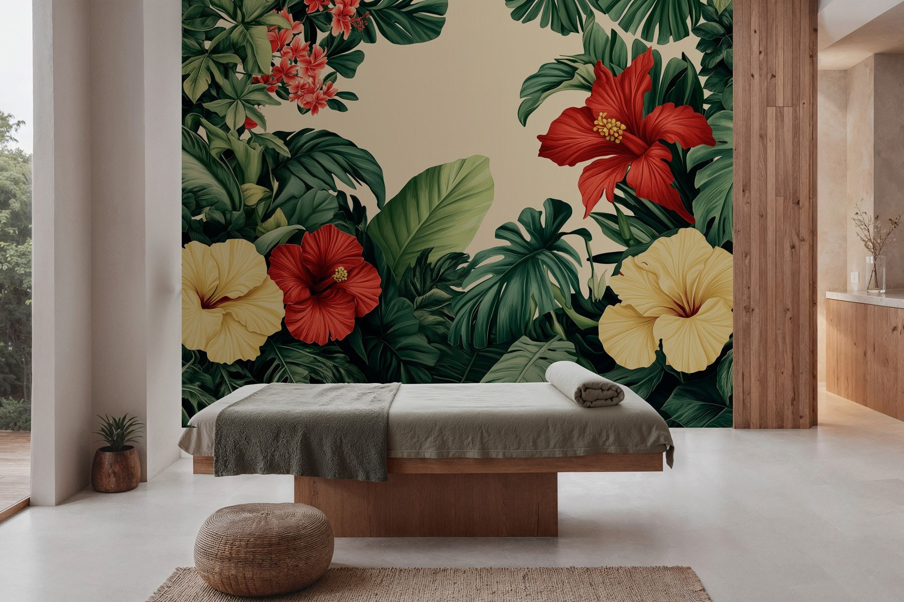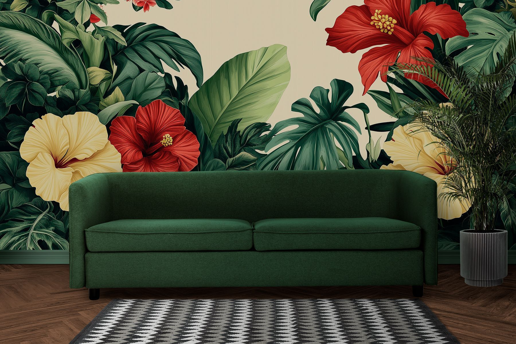 Trasforma qualsiasi stanza in un rifugio tropicale con questo splendido murale che raffigura un vivace gruppo di fiori e foglie rigogliose. Immagina di entrare nel tuo spazio e di essere accolto da audaci fiori di ibisco e verdi intensi. È come una mini vacanza direttamente a casa tua! Questo murale non solo aggiunge colore, ma anche un tocco di vivacità, perfetto per illuminare il tuo salotto o per invitare un tocco di natura in un accogliente angolo lettura. Immagina di sorseggiare un drink mentre ti godi questa bellezza botanica: pura felicità! Perfetto per chiunque desideri un tocco di fascino naturale senza dover innaffiare nulla.