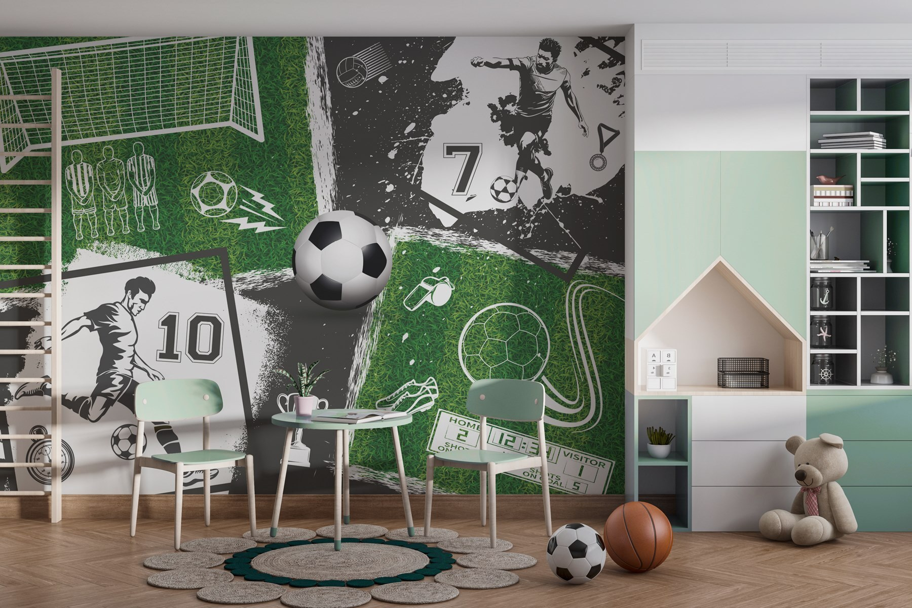 The kicks, the goals, the suspense! It doesn’t just look cool; it makes you feel pumped. Whether it’s game day or just another Tuesday, this mural brings an electric vibe. Perfect for kids, enthusiastic fans, or anyone wanting to add a fun pop to their decor. Every glance transports you to the field, and who knows? You might even feel the urge to kick back with a soccer ball.