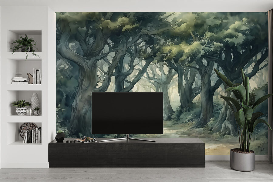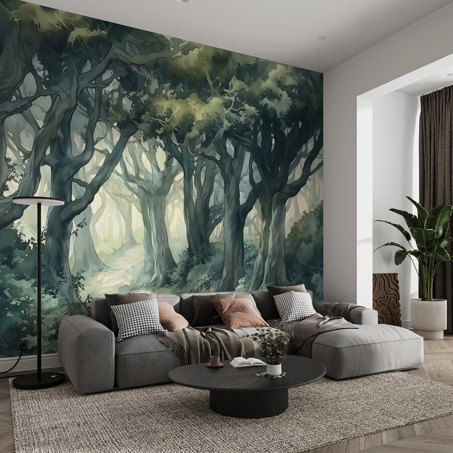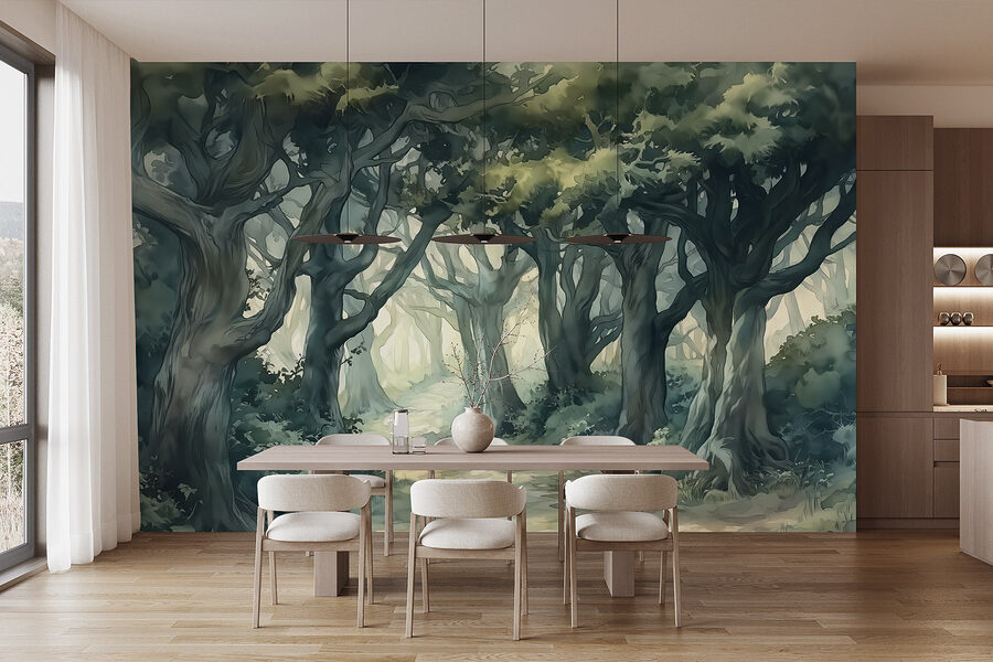 Le tonalità delicate e gli alberi dettagliati creano un’atmosfera pacifica, ideale per un accogliente angolo lettura o una camera da letto serena. Immaginatevi di sistemarvi con una tazza di tè, con la scena rilassante che vi avvolge come un caldo abbraccio. E chi ha detto che la natura non può tornare a casa? Aggiungete questo murale e improvvisamente sognare avventure nel bosco diventerà un’attività quotidiana.