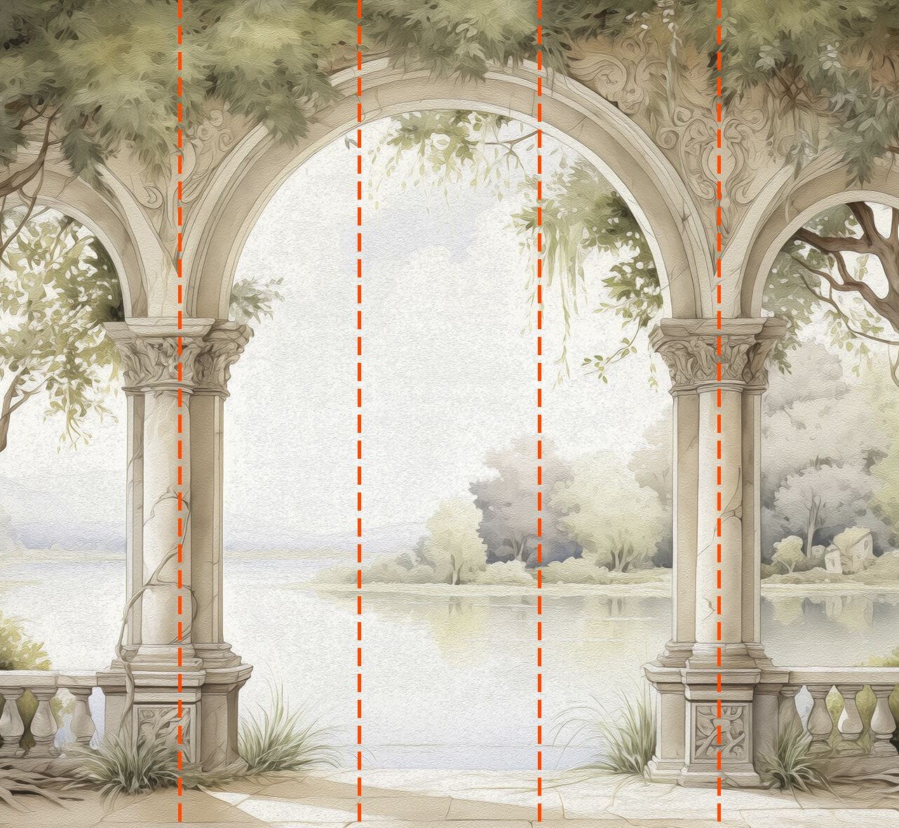 Carta da parati Acquerello di un arco in pietra con alberi e un lago