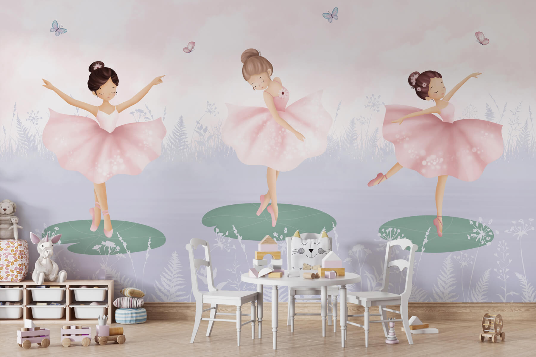 Trasformate la cameretta di un bambino in un paese delle meraviglie da sogno con questo delizioso murale che raffigura un trio di bambine in gonna tutù che danzano sulle ninfee. Immaginate la gioia dei visi dei bambini quando entrano in uno spazio dove le favole prendono vita. Ogni ballerina volteggia con grazia, circondata da farfalle stravaganti e da morbide tonalità pastello che danno un tono tranquillo. È come entrare in un balletto sereno, dove ogni sguardo scatena creatività e risate. Questo murale non è solo un oggetto d’arredo, ma un portale per l’immaginazione, perfetto per suscitare storie di avventure magiche durante i momenti di tranquillità o prima di andare a dormire. Illumina senza sforzo qualsiasi parete, portando fascino e allegria che riempiono la stanza di calore e fantasia.