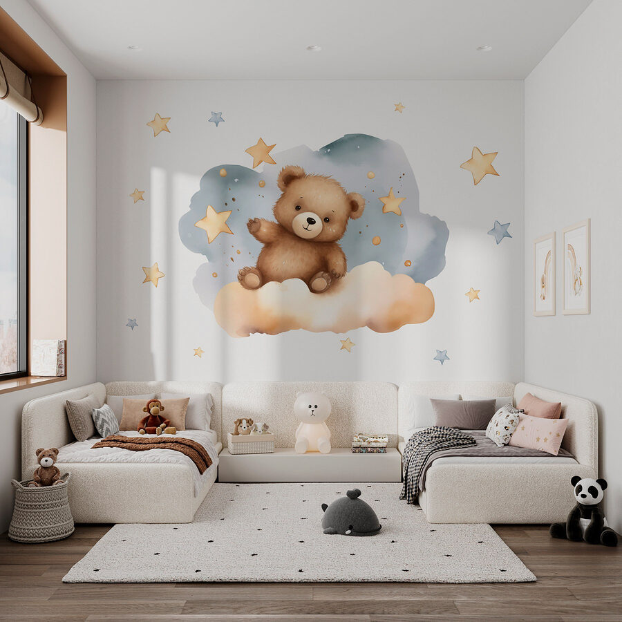Trasforma qualsiasi spazio in un paese delle meraviglie da sogno con il murale “Orsacchiotto su una nuvola”! Immagina questo: un morbido orsacchiotto accoccolato su una nuvola, che ti saluta con la mano come se ti avesse appena visto dall’altra parte della stanza. I tenui toni del blu e del giallo creano un’atmosfera accogliente e serena, perfetta per una nursery o una stanza dei giochi. Immaginate i più piccoli che guardano questa scena adorabile, addormentandosi mentre sognano nuvole soffici e notti stellate. Questo murale non è solo carino, ma avvolge la stanza in un’atmosfera calda e fantasiosa. È come avere un amico magico appeso alla parete, pronto a ispirare sogni d’oro e sorrisi infiniti! Inoltre, è un ottimo spunto di conversazione: chi non si scioglierebbe davanti a un orsacchiotto così delizioso?