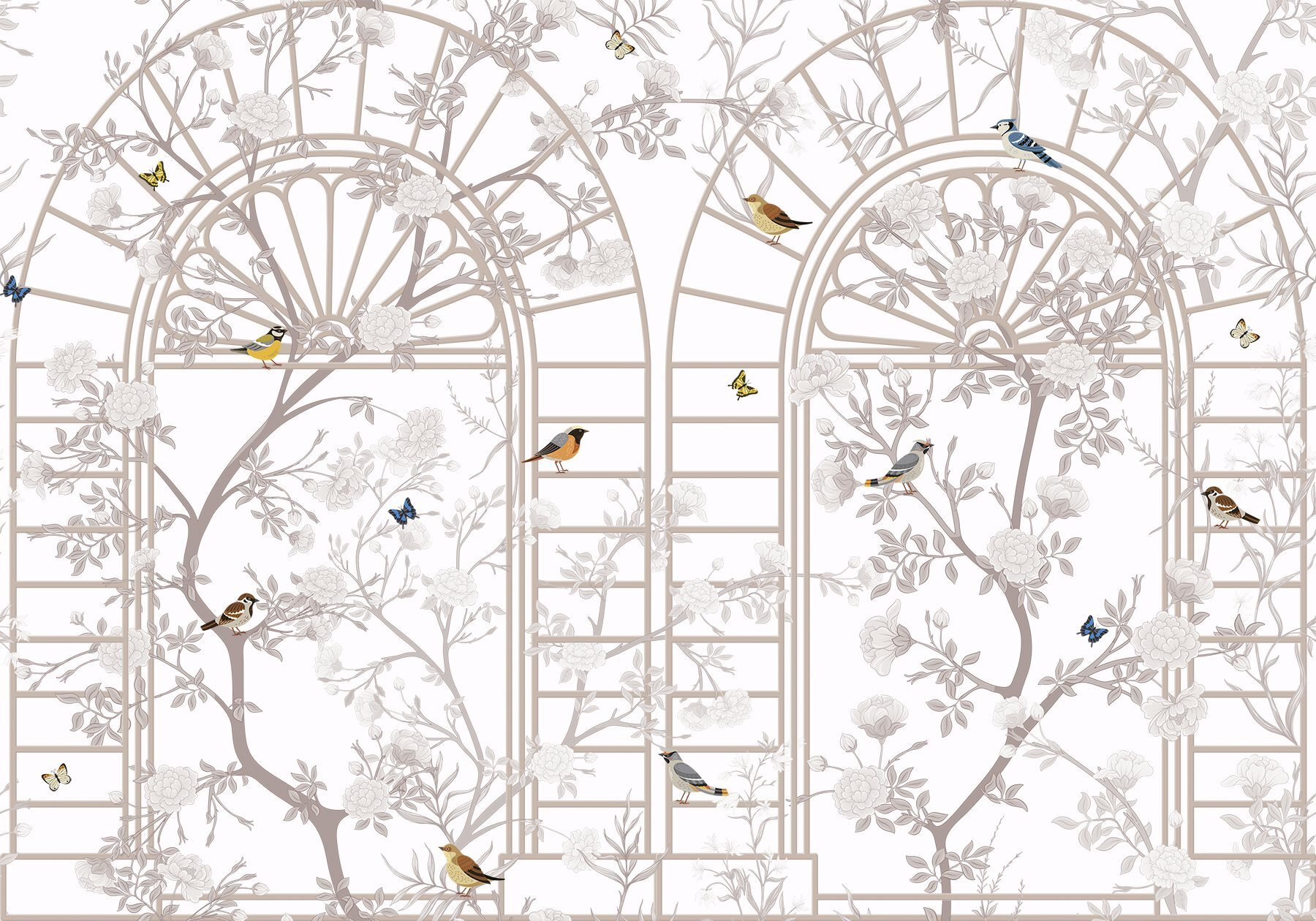 Immaginate di entrare in una stanza accogliente e di essere accolti da questo affascinante murale, con tanto di scala! “Carta da parati murale con scala e uccellini” porta un tocco di natura direttamente in casa vostra. Con delicati fiori e allegri uccellini, dipinge una scena serena che fa sentire chiunque come se stesse sbirciando in un tranquillo giardino.