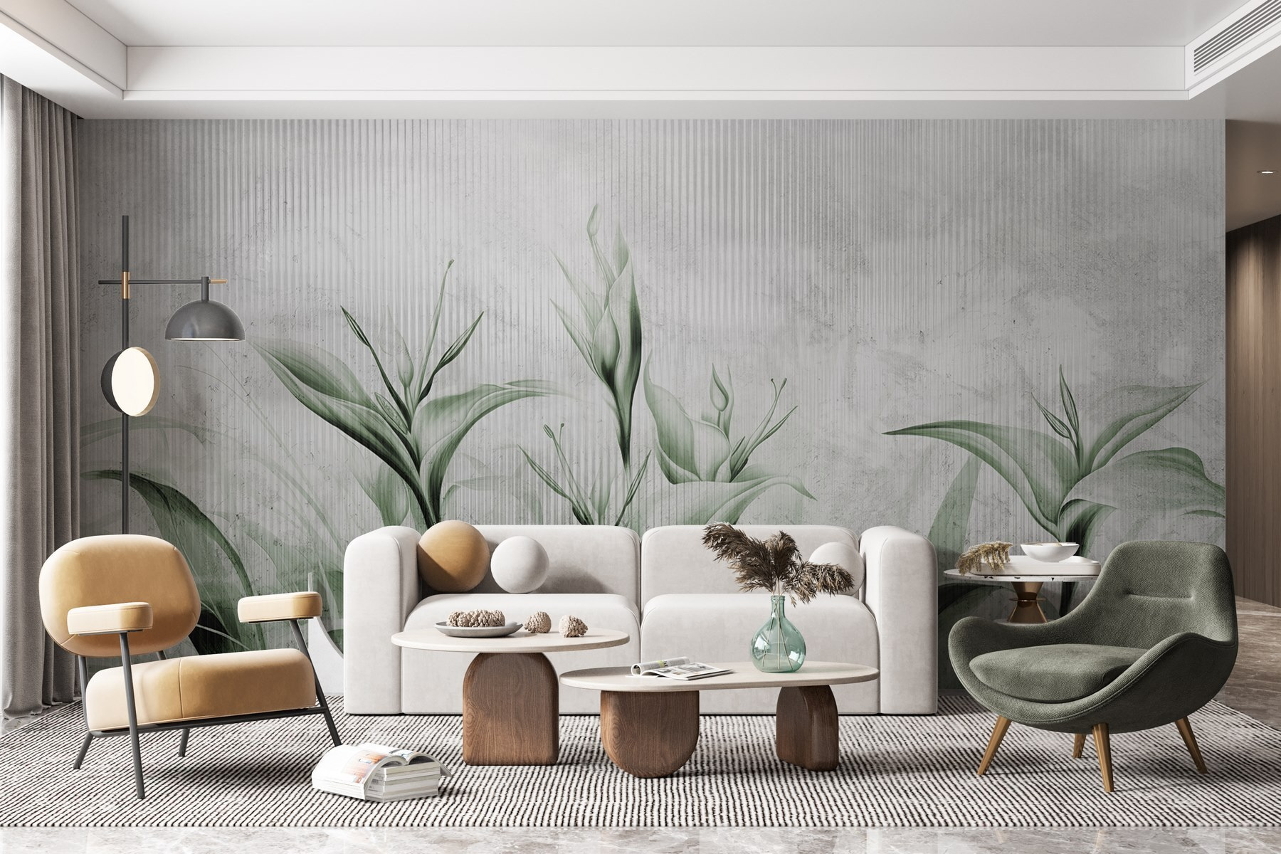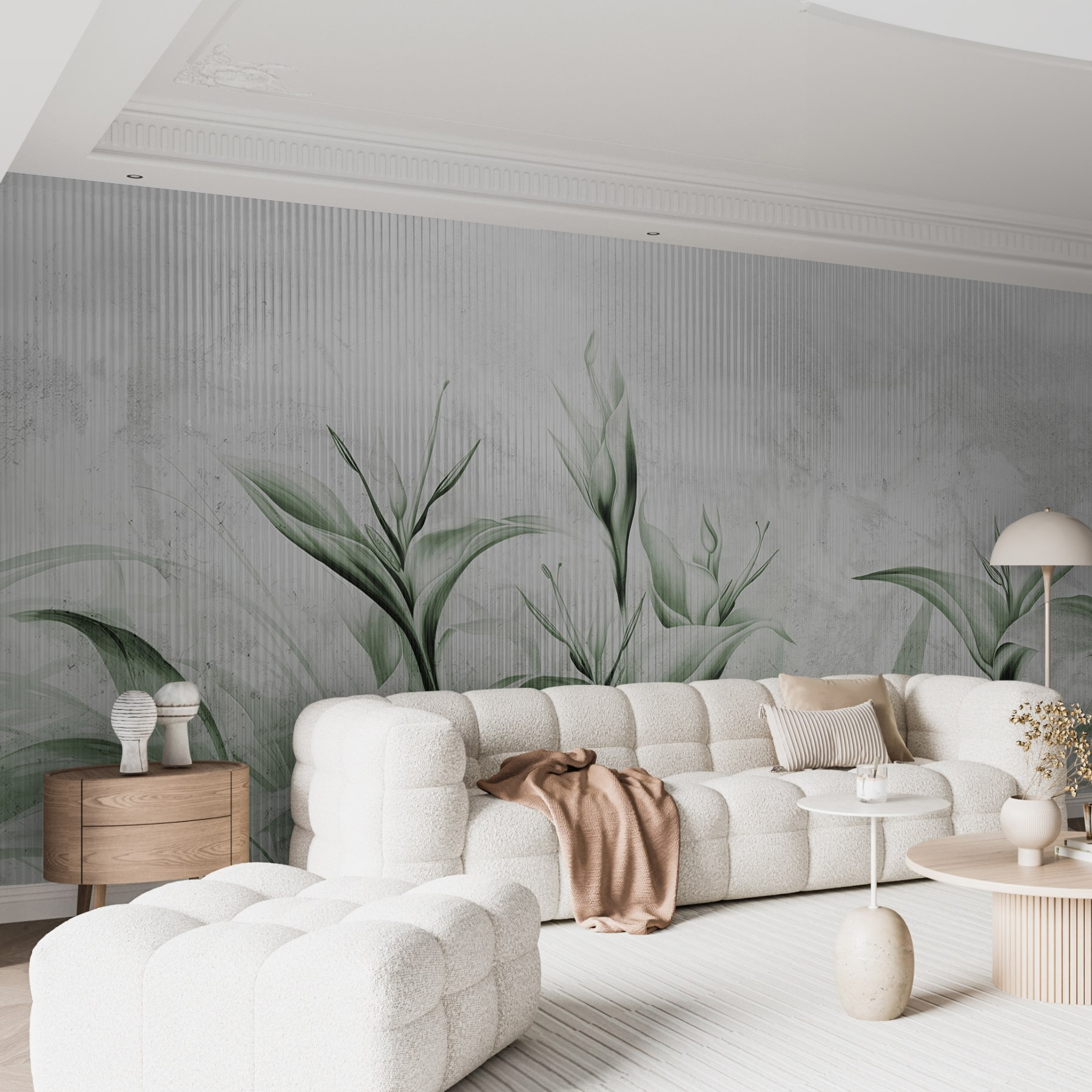 Guardate esattamente come apparirà il vostro spazio con la nuova carta da parati prima di acquistarla. Visualizzazione professionale da parte di designer esperti senza alcun costo o obbligo di acquisto.