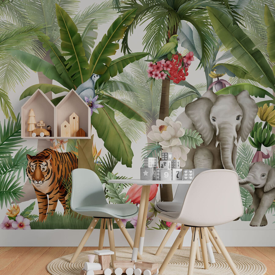Trasforma il tuo spazio con questo vivace murale della giungla, dove scimmie giocose si dondolano e maestosi elefanti vagano liberamente. È come entrare in una vivace foresta pluviale, senza le punture di zanzara! Il verde lussureggiante e i colori vivaci degli uccelli creano uno sfondo rilassante e rinvigorente. Immagina di sorseggiare il tuo caffè mattutino mentre senti il calore del sole e la brezza leggera… oh, aspetta, è solo il tuo accogliente salotto! Perfetto per gli amanti degli animali, questo murale porta la natura selvaggia in casa, suscitando gioia e rendendo ogni momento un’avventura. Goditi l’atmosfera tropicale tutto l’anno!