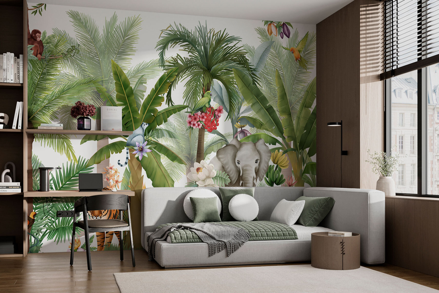 Trasforma il tuo spazio con questo vivace murale della giungla, dove scimmie giocose si dondolano e maestosi elefanti vagano liberamente. È come entrare in una vivace foresta pluviale, senza le punture di zanzara! Il verde lussureggiante e i colori vivaci degli uccelli creano uno sfondo rilassante e rinvigorente. Immagina di sorseggiare il tuo caffè mattutino mentre senti il calore del sole e la brezza leggera… oh, aspetta, è solo il tuo accogliente salotto! Perfetto per gli amanti degli animali, questo murale porta la natura selvaggia in casa, suscitando gioia e rendendo ogni momento un’avventura. Goditi l’atmosfera tropicale tutto l’anno!