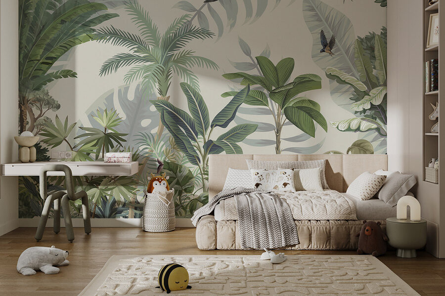 Trasforma una parete semplice in un paradiso lussureggiante con questo murale tropicale! Immagina una vegetazione rigogliosa e uccellini allegri che svolazzano: è come portare una mini foresta pluviale direttamente nel tuo salotto. Immagina di sorseggiare il tuo caffè mattutino mentre questo murale ti trasporta in una giungla illuminata dal sole. I colori rilassanti e i ricchi dettagli trasmettono calore e relax. Inoltre, è un ottimo spunto di conversazione! Che tu sia un amante della natura o abbia semplicemente bisogno di un tocco di vivacità nella tua casa, questo murale farà sentire tutti un po’ più avventurosi: chi avrebbe mai detto che le pareti potessero essere così emozionanti?