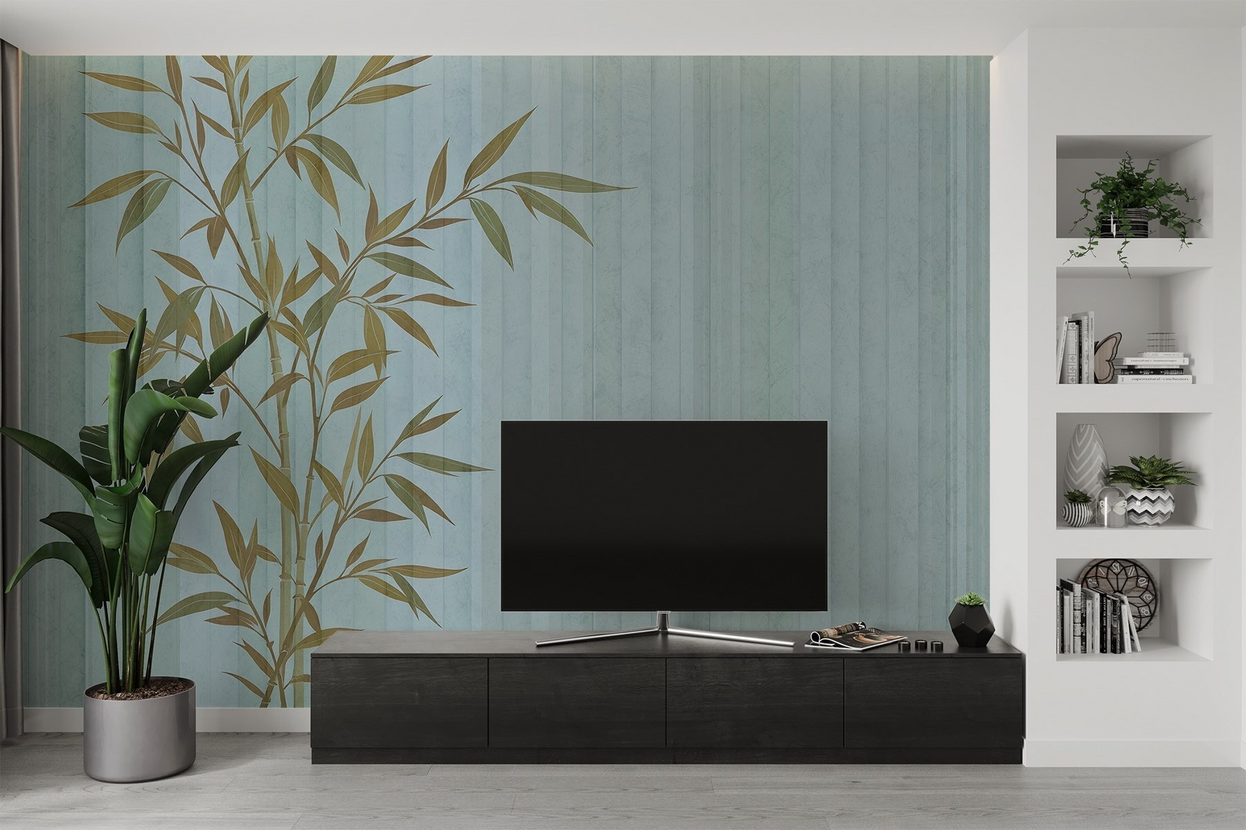 Guardate esattamente come apparirà il vostro spazio con la nuova carta da parati prima di acquistarla. Visualizzazione professionale da parte di designer esperti senza alcun costo o obbligo di acquisto.