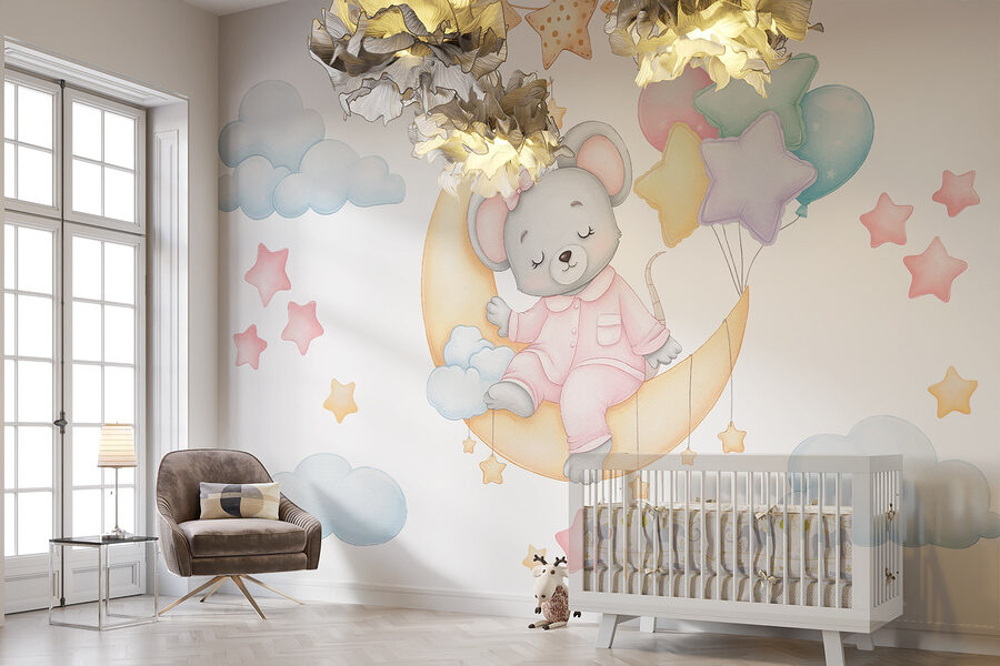 Trasformate qualsiasi stanza in una fuga da sogno con questo incantevole murale che raffigura un topolino accoccolato sulla luna, stringendo palloncini colorati. Immaginate una luce soffusa che illumina le piccole stelle, mentre il vostro piccolo si addormenta sognando stravaganti avventure tra le nuvole. È come una favola della buonanotte che prende vita, perfetta per le camerette o le stanze dei giochi! La tavolozza di colori pastello crea un’atmosfera rilassante, che rende facile immaginare tutte le risate e i sogni d’oro che questa incantevole scena potrebbe ispirare. Aggiungete una spruzzata di magia alle pareti e lasciate che l’immaginazione si scateni!