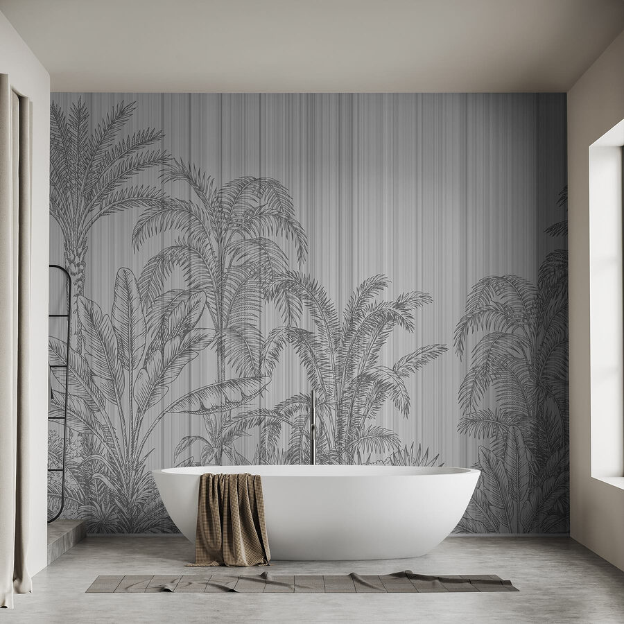 Trasformate il vostro spazio con questo splendido murale che sussurra “oasi tropicale” senza bisogno di crema solare. Lo sfondo grigio e bianco con le palme aggiunge un tocco di tranquilla raffinatezza. Immaginate di entrare nella vostra stanza e di sentirvi immediatamente come in una serena fuga su un’isola.