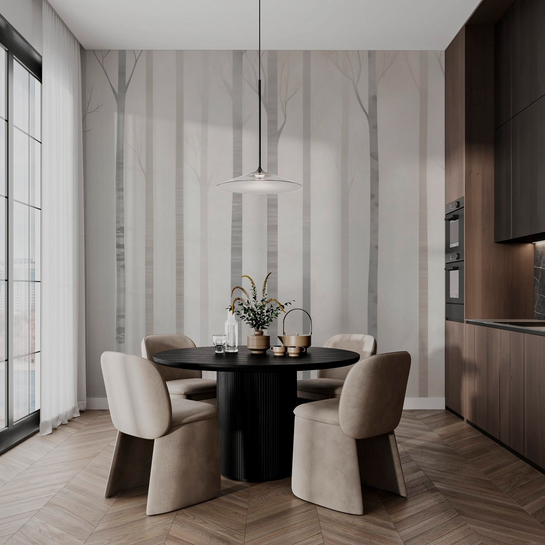 Entrate in un mondo da sogno con questo murale che raffigura un sereno gruppo di alberi avvolti da una leggera nebbia. È come avere una fetta di natura proprio nel vostro spazio vitale, senza il rischio di calpestare il fango. Immaginatevi di accoccolarvi con un buon libro mentre i tronchi morbidi e spettrali creano uno sfondo tranquillo. Aggiungono un tocco di ariosità, facendo sentire gli ambienti spaziosi e luminosi. Perfetto per chi desidera un legame con l’aria aperta ma anche le comodità di casa. Questo murale sussurra tranquillità e invita alla creatività: un vero e proprio spunto di conversazione! Chi non vorrebbe fissare una foresta serena mentre sogna ad occhi aperti?