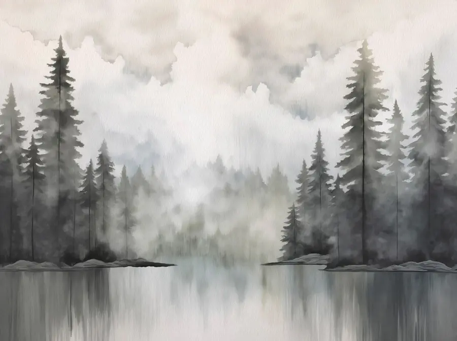 Trasformate qualsiasi spazio con questo splendido murale ad acquerello raffigurante una foresta e un lago sereno. Immaginate di entrare in una stanza e di sentirvi come se foste entrati nell’abbraccio della natura. Le morbide tonalità di grigio e verde offrono un’atmosfera rilassante, perfetta per creare un rifugio tranquillo nella vostra casa.