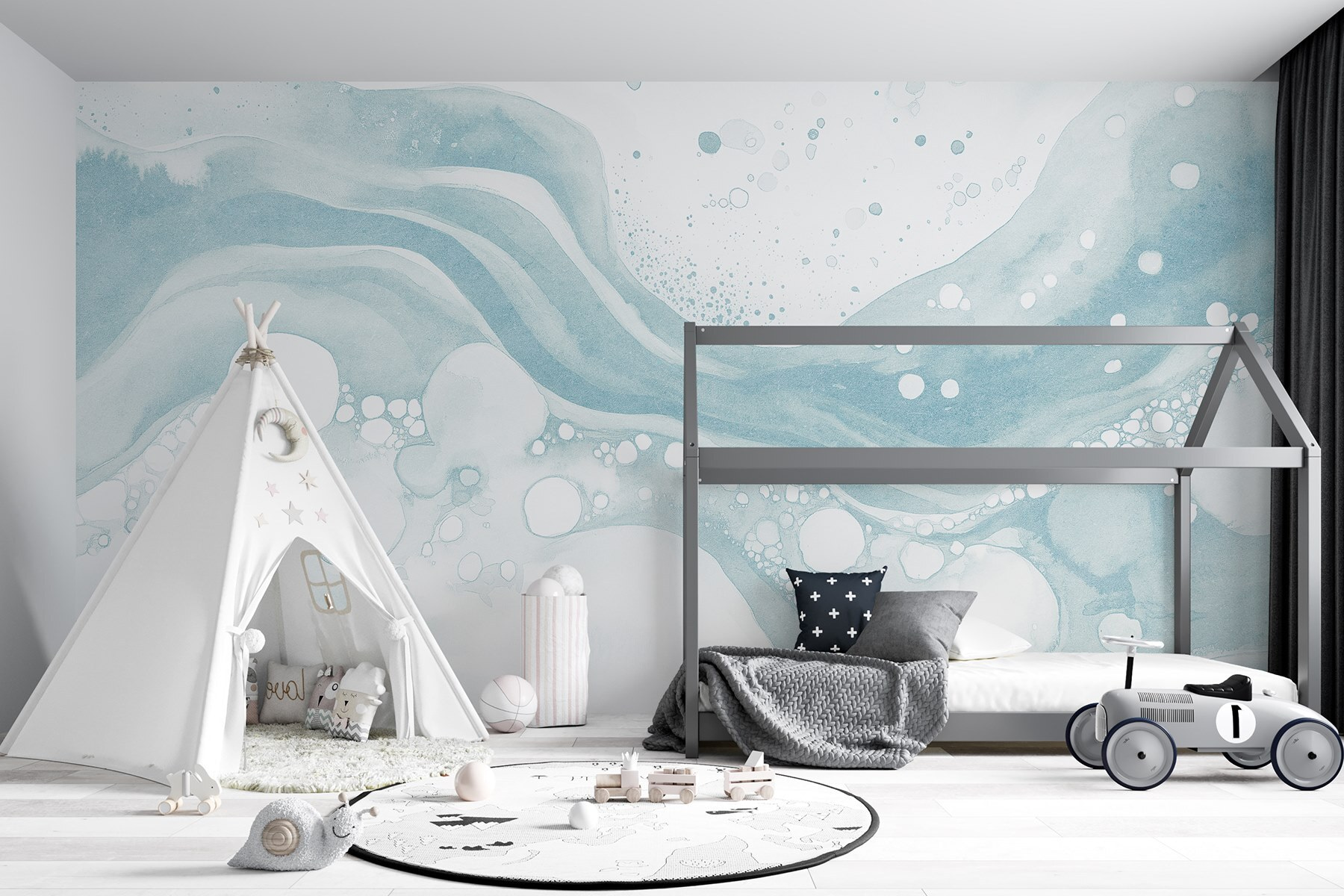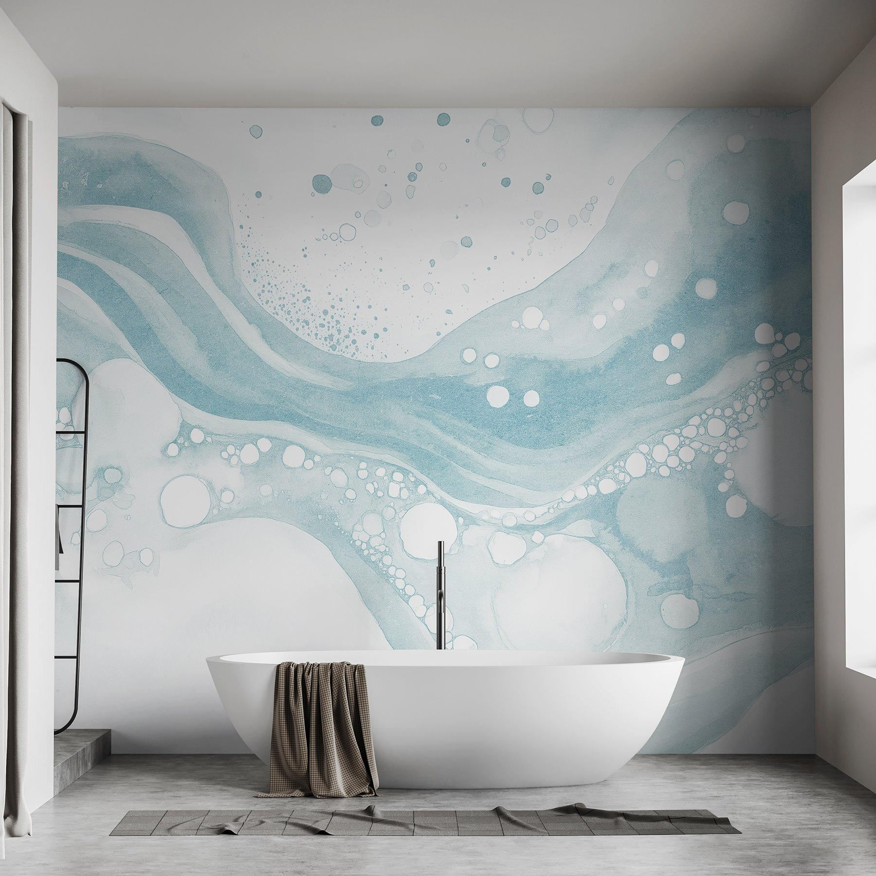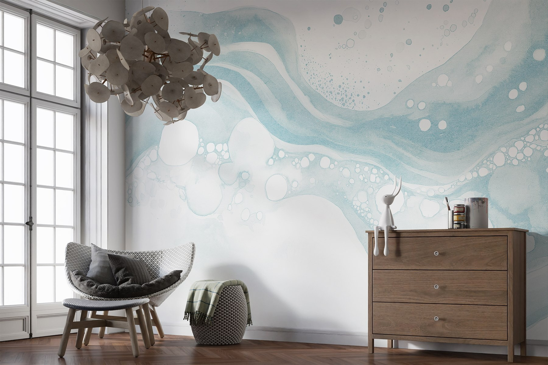 Trasformate il vostro spazio con questo murale, un’incantevole miscela di acquerelli bianchi e blu che ricorda una dolce brezza marina catturata su tela. Immaginatelo mentre illumina un accogliente angolo lettura o aggiunge un tocco di calma a un salotto affollato. Le curve morbide e le bolle giocose invitano a sognare le pigre giornate in spiaggia, calmando i sensi. È quasi come se il murale sussurrasse: “Fai un respiro profondo, rilassati”. Perfetto per gli amanti della natura o per chiunque desideri un tocco di serenità nella propria casa. Immaginate di sorseggiare un tè mentre questo murale illumina le vostre pareti: chi non vorrebbe questa atmosfera?
