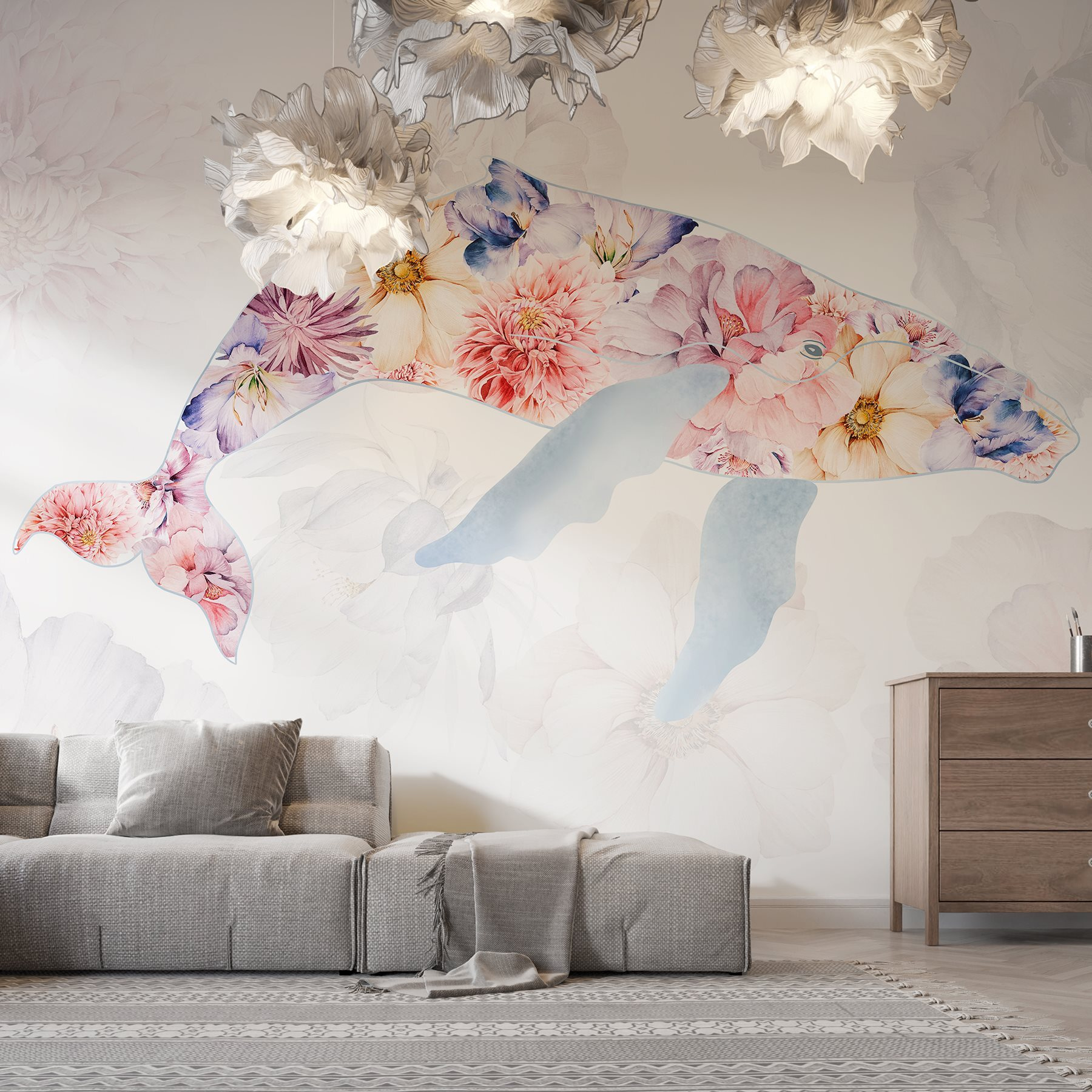 Immergetevi in un mondo in cui il fascino dell’oceano incontra la bellezza floreale con questo splendido murale. Immaginate un delfino, giocosamente schizzato con fiori vivaci che sembrano danzare sulle pareti. È come avere un giardino segreto sotto le onde: chi avrebbe mai immaginato che le sirene avessero un tale gusto per l’arredamento? Questo murale invita a un senso di tranquillità, facendo sentire ogni stanza come un accogliente rifugio sul mare. Immaginate di oziare in una giornata di pioggia, sorseggiando un tè mentre guardate questa opera d’arte e sentite le onde delicati che vi travolgono. Non è solo un murale, è una mini vacanza per le vostre pareti!