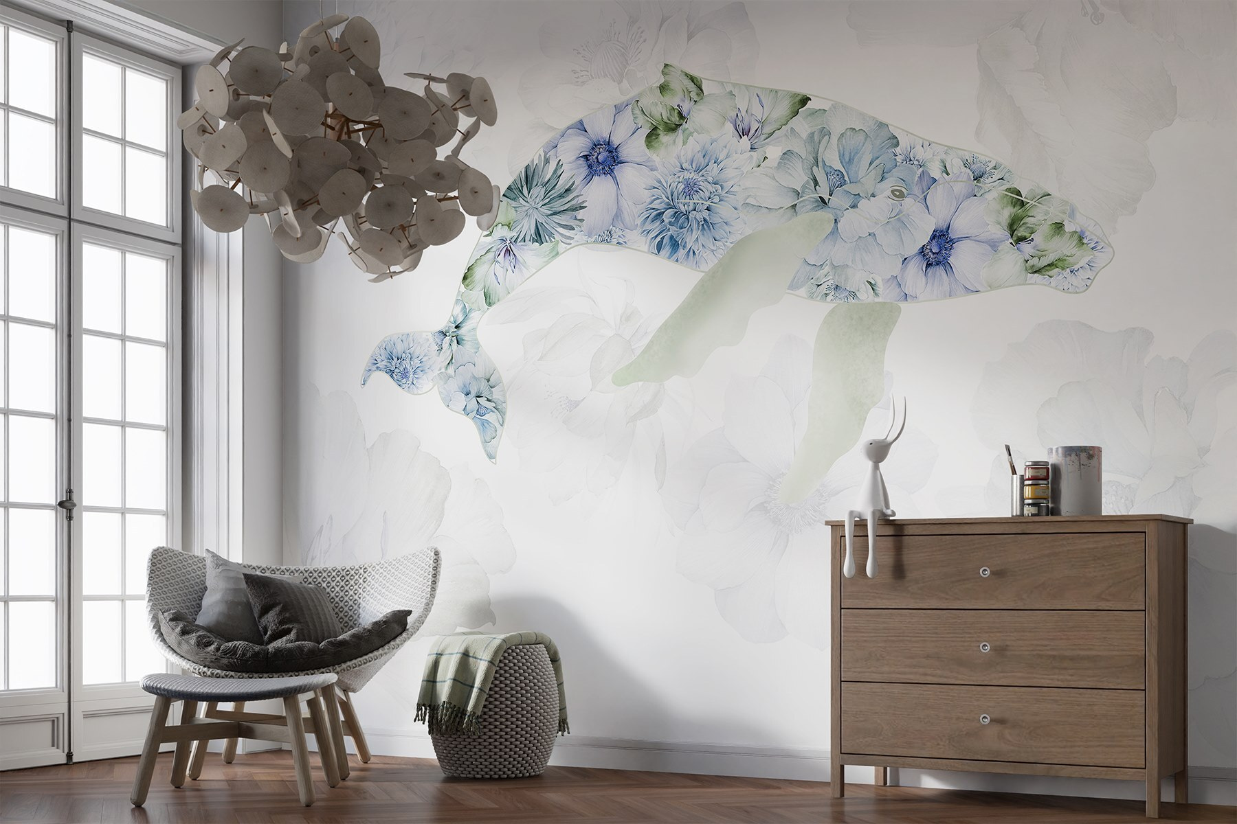 Trasformate il vostro spazio con questo incantevole murale con una balena che scoppia di fiori giocosi. Immaginate di entrare in una stanza e di sentire immediatamente la calma del mare e l’estrosità di un giardino. Le tonalità tenui e i petali delicati invitano a un’atmosfera morbida e serena, perfetta per un accogliente angolo lettura o anche per una giocosa stanza dei bambini. È come avere un pezzo di natura proprio sulla parete, che cattura la gioia della vita oceanica e la bellezza floreale. Immaginate gli amici che lo ammirano e che vi chiedono dove avete trovato un tale gioiello. Tuffatevi e lasciate che il murale dia vita alle vostre pareti!