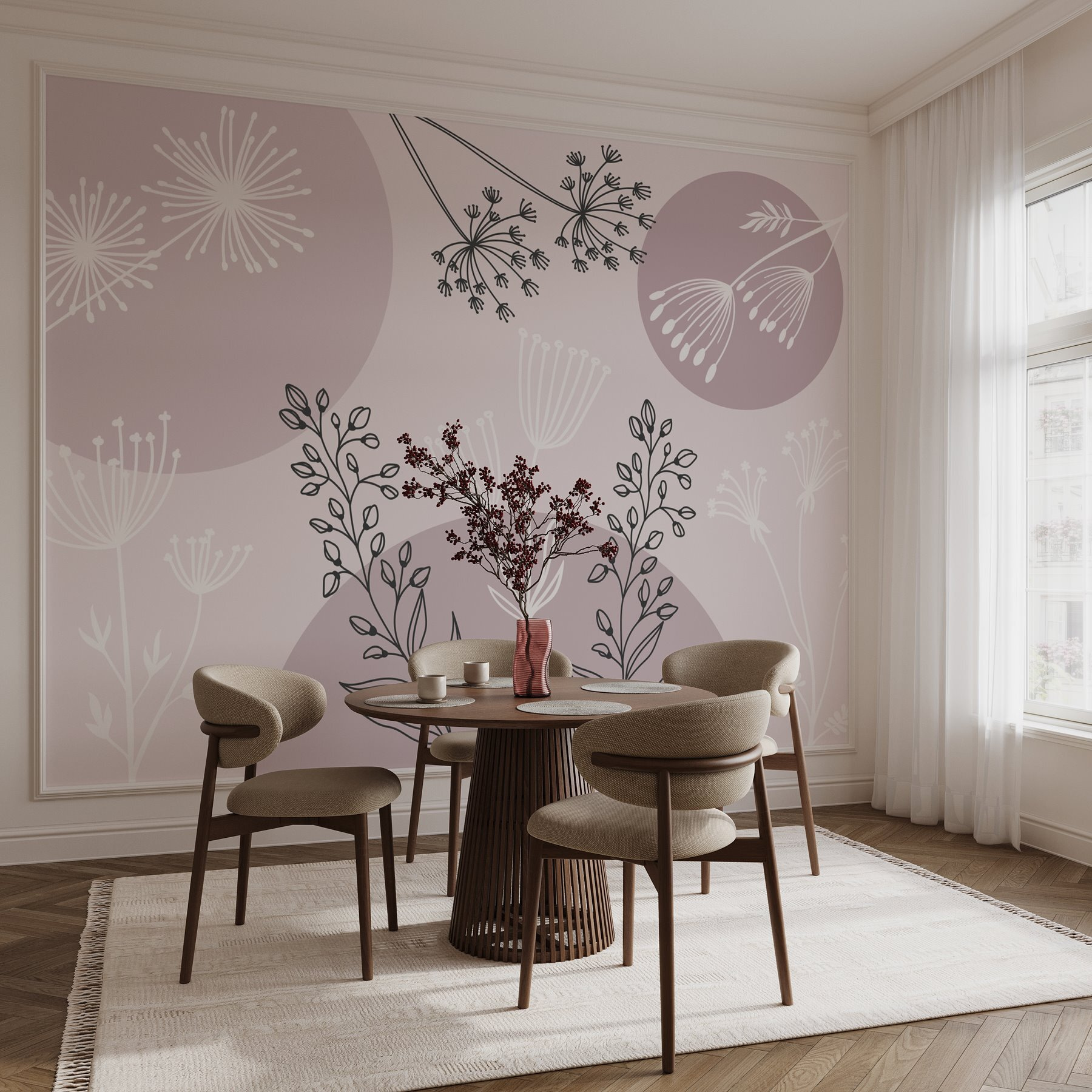 Trasformate qualsiasi stanza in un’oasi serena con questo affascinante murale con fiori e piante delicate. Lo stile morbido dell’acquerello danza con una miscela di tinte delicate e linee aggraziate, facendo sembrare che la primavera abbia preso dimora permanente sulle vostre pareti. Immaginate di sorseggiare una tazza di tè circondati da questa allegra fioritura, portando una fetta di natura all’interno della casa. È perfetto per chi vuole che il proprio spazio sia leggero e rinfrescante. Inoltre, è un elemento di conversazione immediato: chi non vorrebbe parlare di un bel giardino proprio nel suo salotto? Abbracciate questa fresca atmosfera botanica e lasciate che sia la vostra parete a parlare!