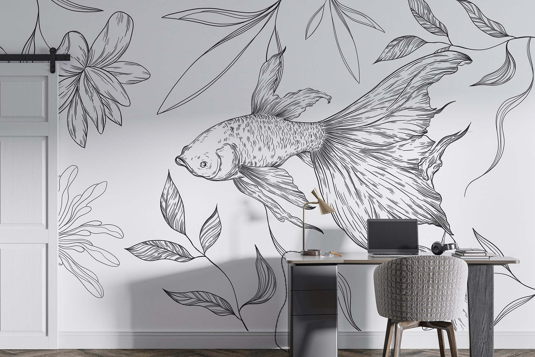 Trasformate qualsiasi spazio con questo accattivante murale che raffigura un affascinante pesce che scivola tra piante delicate. Il design in bianco e nero dona un tocco di eleganza senza invadere l’ambiente. Immaginate di sorseggiare un caffè, mentre le dolci linee danzano sulla parete, stimolando pensieri tranquillizzanti e idee creative. È come un sussurro della natura, che invita alla pace nella frenesia. Perfetto per tutti coloro che desiderano aggiungere un po’ di magia artistica alle proprie pareti, è anche un elemento di conversazione. Chi non vorrebbe parlare del “compagno di nuoto” sulla propria parete?