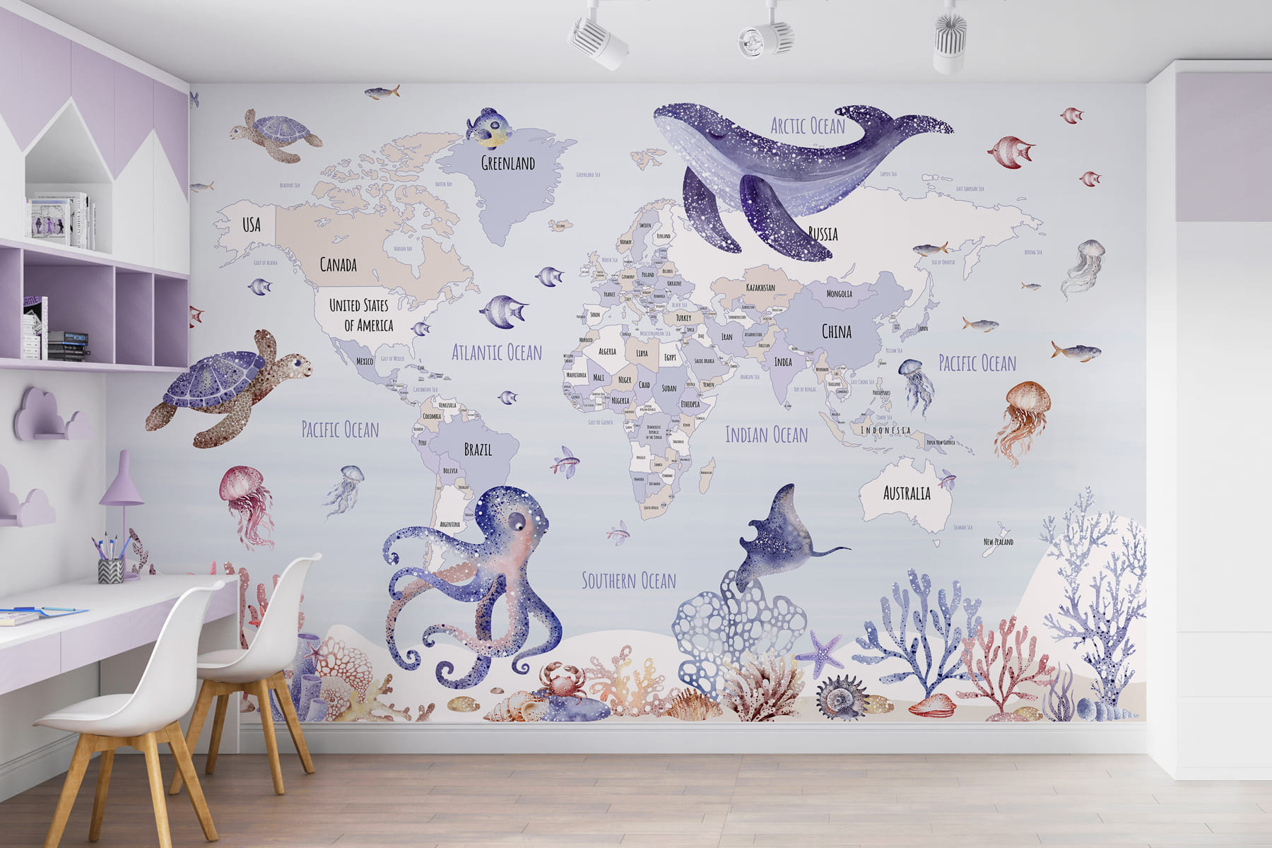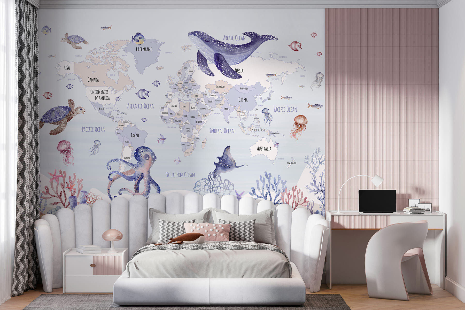 Trasformate qualsiasi stanza in una mini-avventura con questo delizioso murale, che raffigura un’incantevole mappa del mondo avvolta da una spruzzata di vita marina. Immaginate i sorrisi che vi regalerà, invitando i vostri piccoli esploratori a conoscere terre lontane circondati da tartarughe stravaganti, polpi giocosi e balene gentili. Non è solo un murale: è come avere una storia a tema oceanico che aspetta di essere raccontata. Perfetto per le stanze da gioco o per gli angoli più accoglienti, accenderà la curiosità, l’immaginazione e forse trasformerà un noioso martedì in un sogno ad occhi aperti sotto il mare. Chissà, potrebbe ispirare un futuro biologo marino!