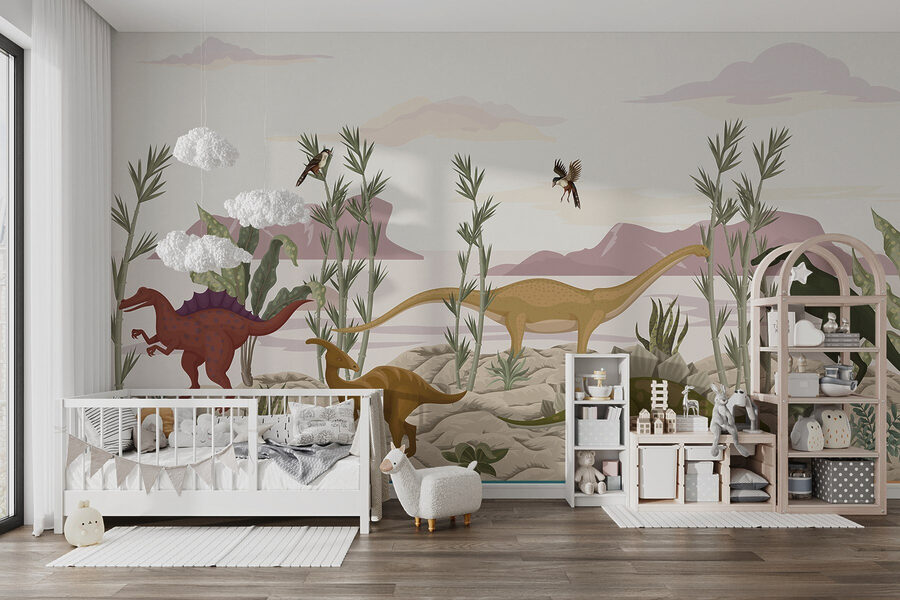 Trasformate qualsiasi spazio con questo vivace murale che raffigura un vivace gruppo di dinosauri che esplorano un paesaggio desertico. Immaginate di entrare in una stanza dove giganti amichevoli come il gentile Brachiosauro e il curioso Stegosauro sembrano prendere vita sulle vostre pareti. I morbidi toni della terra e il verde giocoso creano un’atmosfera calma e allo stesso tempo emozionante. È un perfetto spunto di conversazione: i bambini ameranno indicare i loro preferiti mentre sognano segretamente avventure preistoriche. In una stanza dei giochi o in un angolo accogliente, questo murale vi porterà in un mondo dove i dinosauri prosperano. Chi non vorrebbe un po’ di magia dei dinosauri nel proprio spazio?