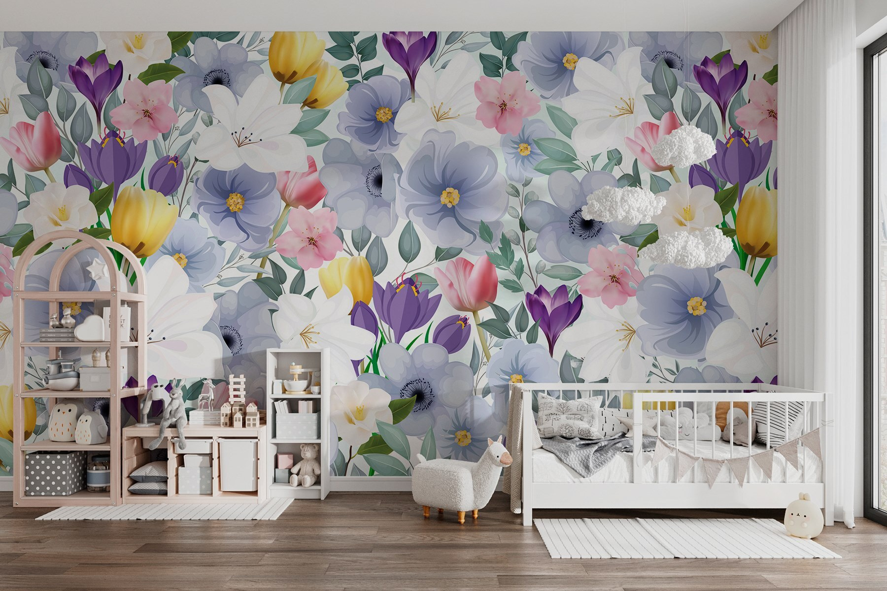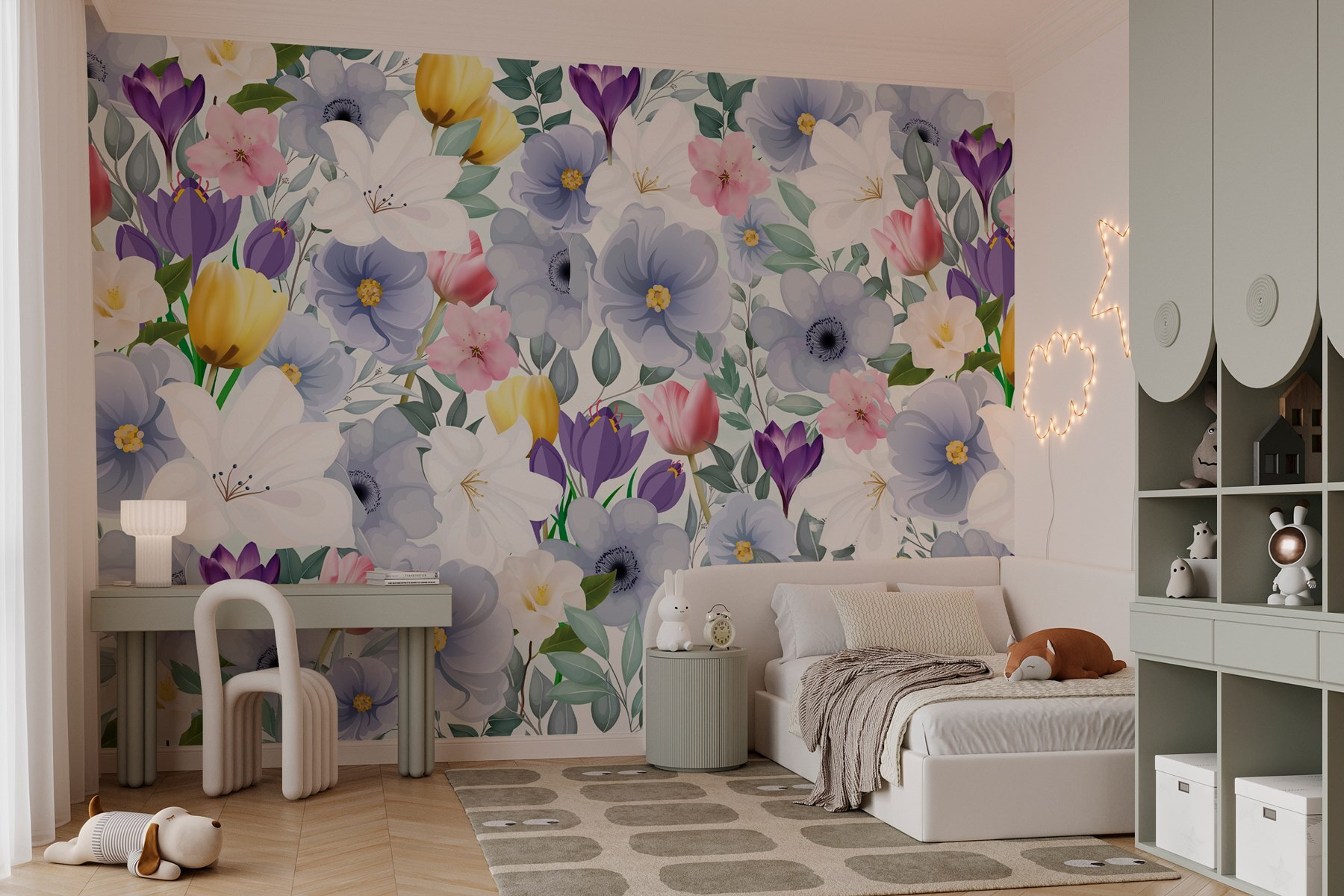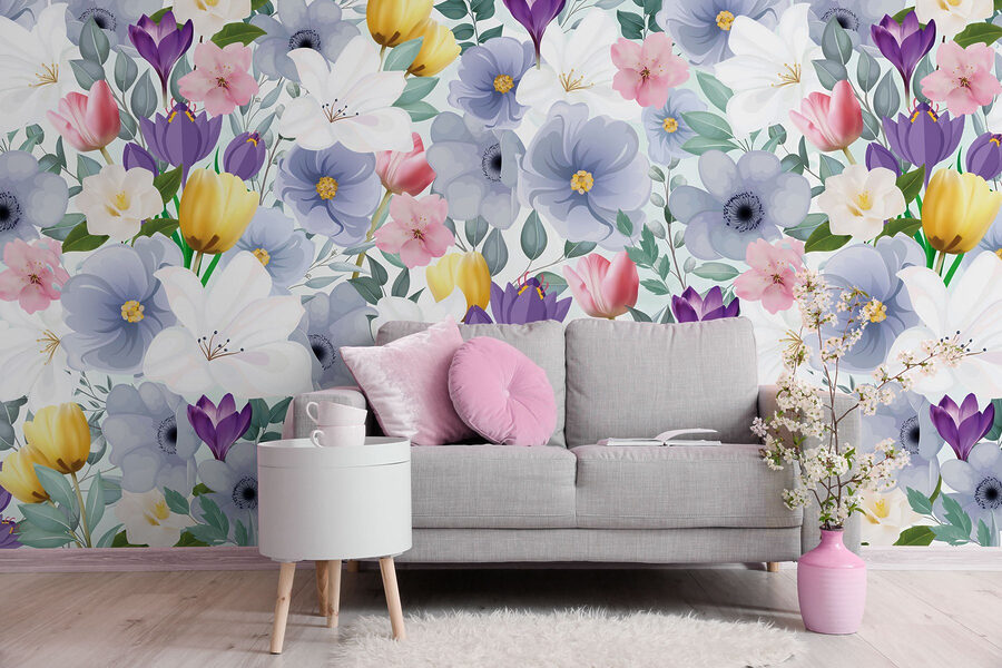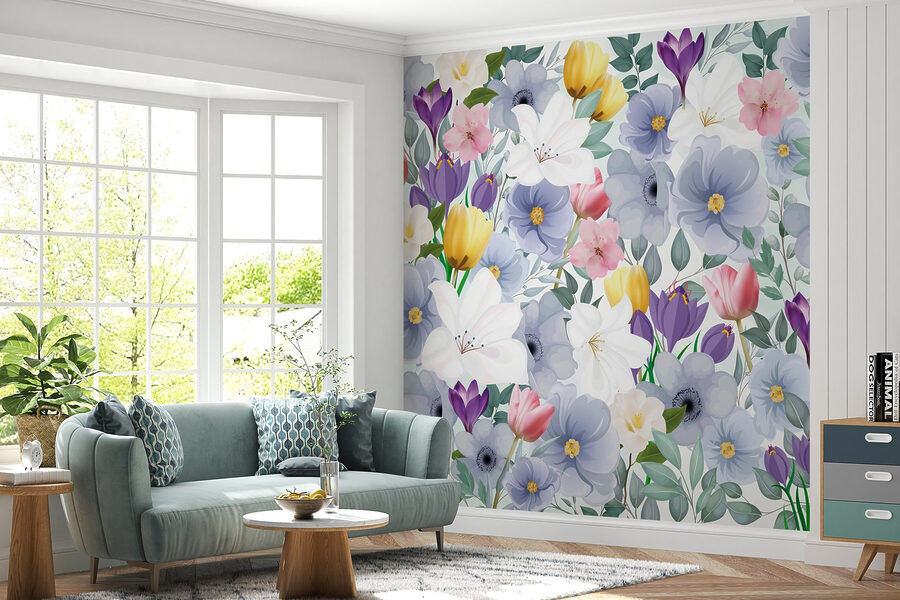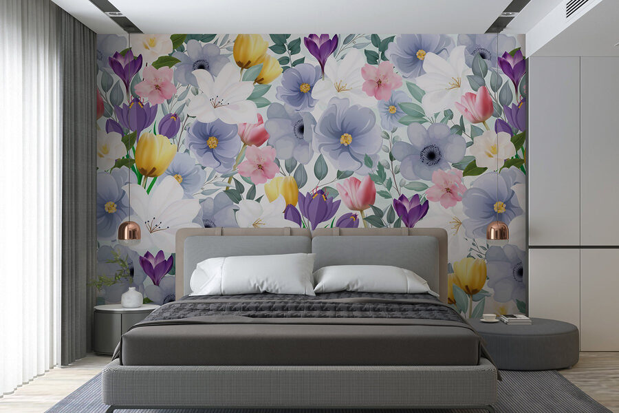 Immaginate di entrare in un mondo in cui i fiori sbocciano tutto l’anno. Questo murale di fiori colorati e verdi foglie porta un’esplosione di gioia in ogni stanza. È come fare una festa in giardino senza le fastidiose api! Con morbide pennellate di acquerello, ogni fiore racconta la sua storia, facendovi sentire quasi come se steste vagando in un prato stravagante.