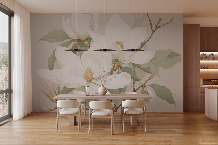 Trasformate qualsiasi ambiente con questo splendido murale di fiori bianchi. Immaginate di entrare nel vostro spazio e di essere accolti da fiori morbidi e sereni che sembrano quasi sussurrare tranquillità. I petali delicati e il verde gentile creano un’atmosfera rinfrescante e rilassante, perfetta per un accogliente angolo lettura o per una tranquilla camera da letto.