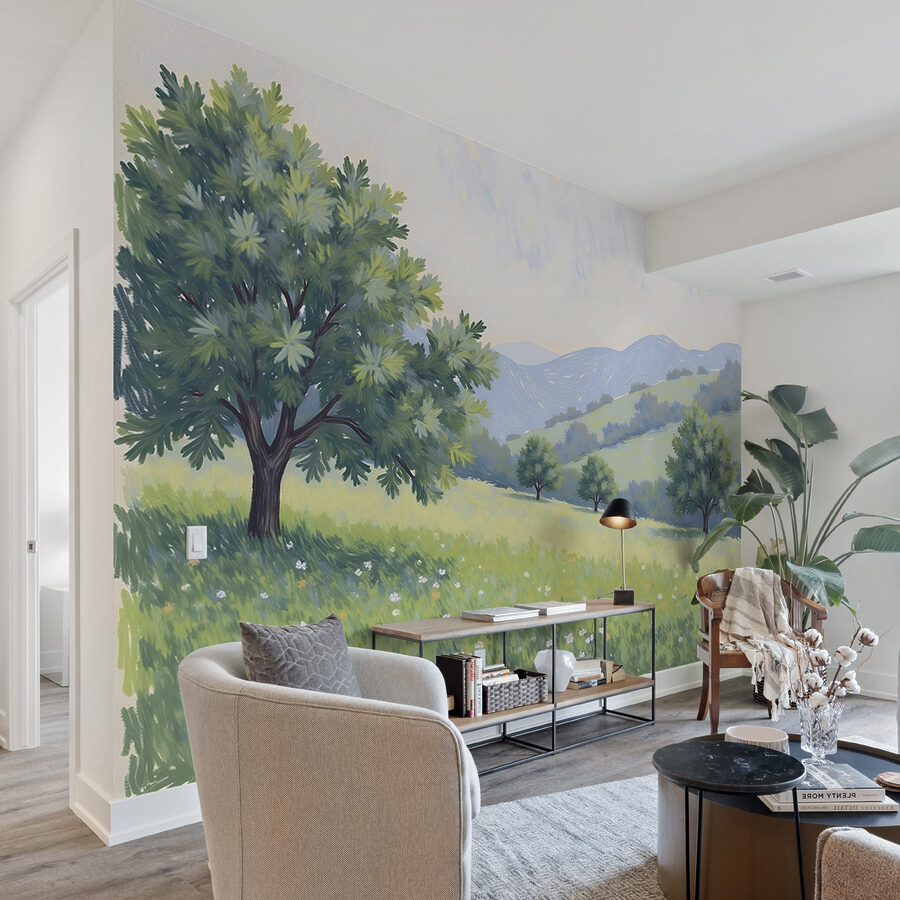 Trasformate qualsiasi stanza in una fuga serena con questo delizioso murale che raffigura un pittoresco paesaggio di dolci colline e allegri alberi. Immaginate di guardare questa scena e di sentire la dolce brezza, quasi di sentire i sussurri della natura. È come una piccola fetta di fascino della campagna proprio a casa vostra. Abbinatela a qualche coperta accogliente e a luci soffuse, e avrete un luogo perfetto per rilassarvi dopo una lunga giornata. Davvero, chi ha bisogno di una vacanza quando si può avere questa atmosfera rilassante a casa propria? È un piccolo cambiamento con un grande impatto!