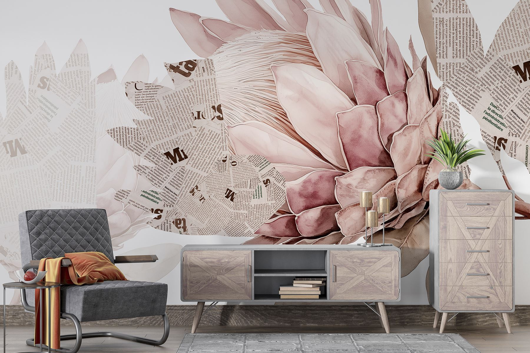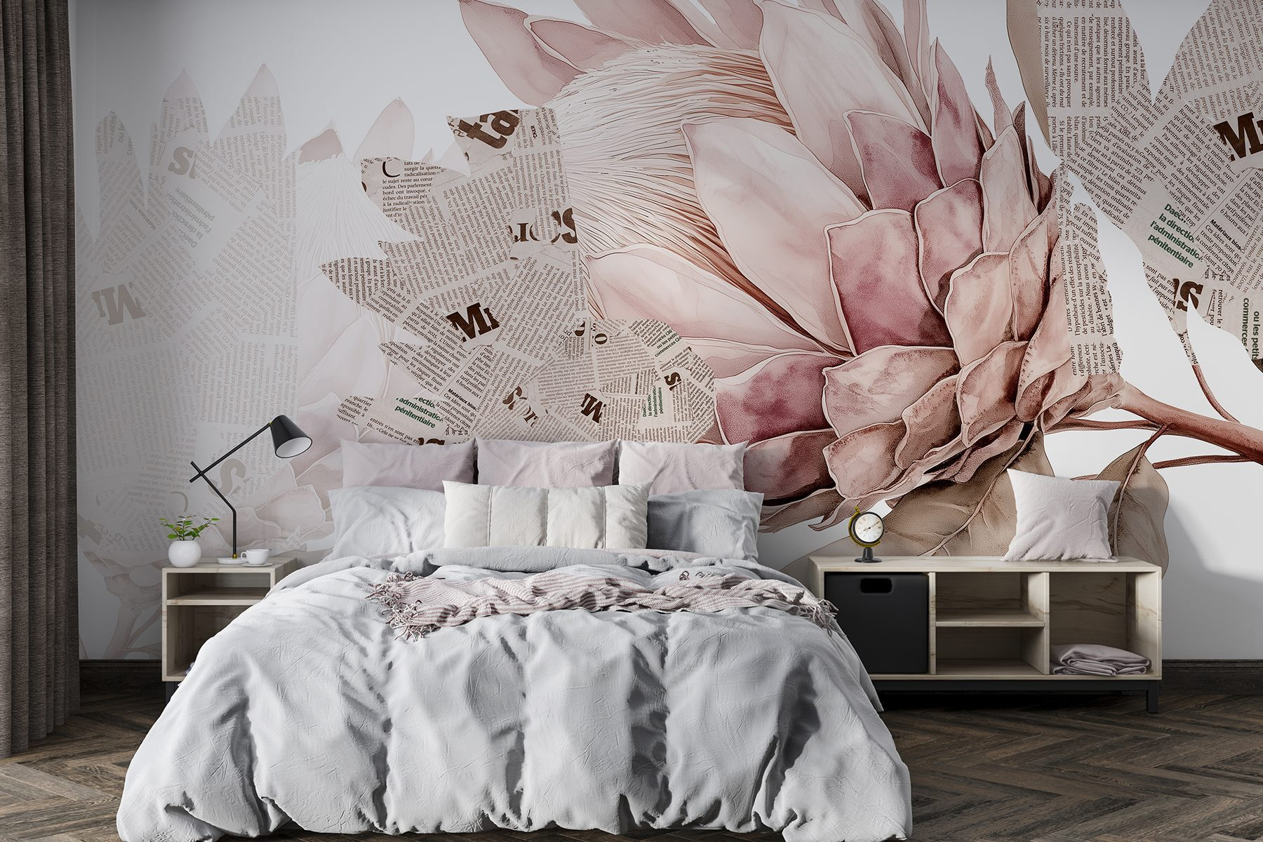 Portate un tocco di natura in casa con questo incantevole murale con deliziose fioriture intrecciate a elementi di giornale. È come un mix tra una festa in giardino e una galleria d’arte, tutto sulla vostra parete. Immaginate di sorseggiare un caffè mentre ammirate come i morbidi petali danzano con il testo in grassetto, stimolando conversazioni e magari un po’ di sogni ad occhi aperti. Questo murale può trasformare qualsiasi stanza in un angolo accogliente e vivo, ma allo stesso tempo elegante. Sussurra all’anima, invitando al calore e a un pizzico di fantasia. Perfetto per gli spazi che desiderano un tocco di personalità e fascino, è un dolce promemoria del fatto che la bellezza può essere trovata in luoghi inaspettati.