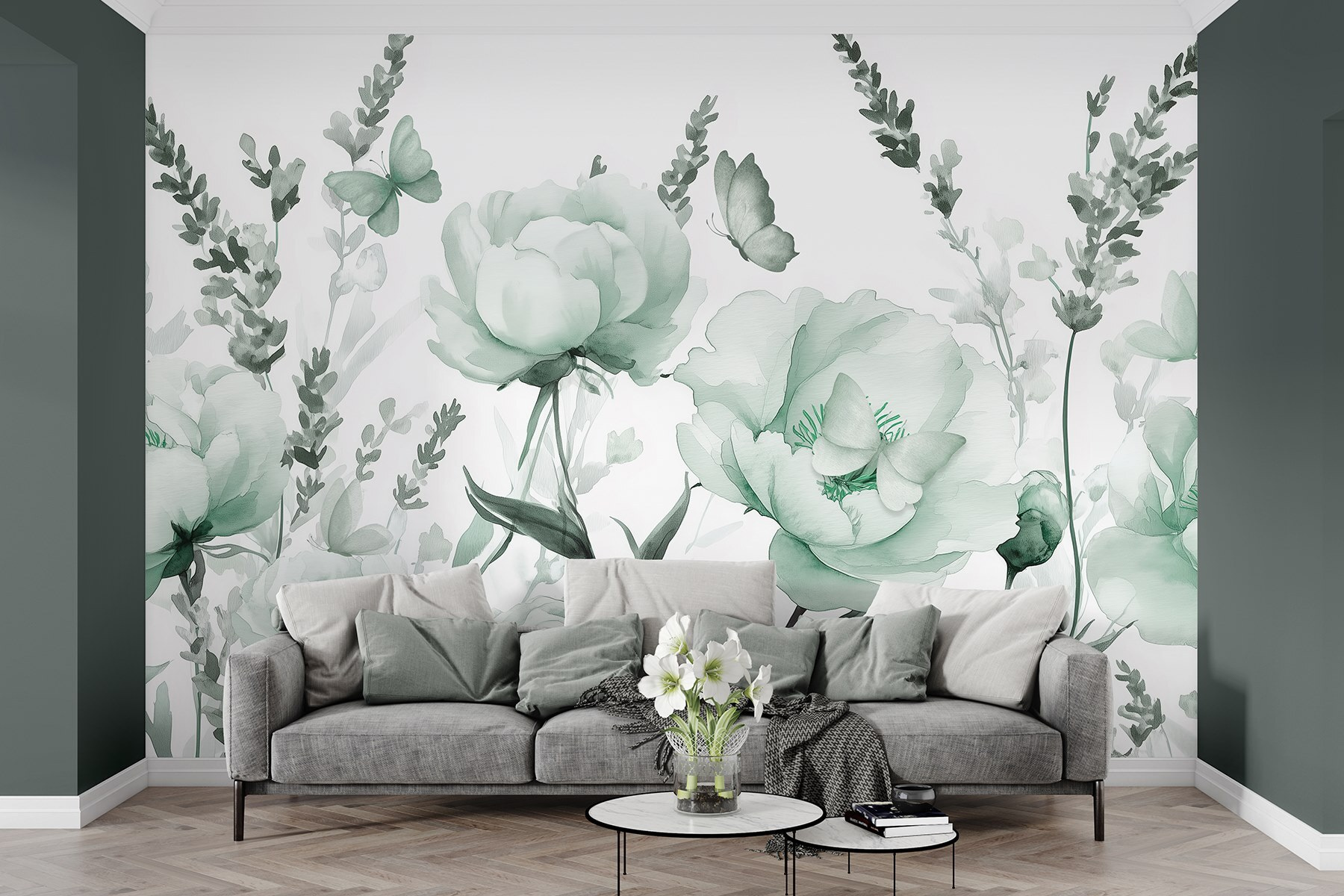 Guardate esattamente come apparirà il vostro spazio con la nuova carta da parati prima di acquistarla. Visualizzazione professionale da parte di designer esperti senza alcun costo o obbligo di acquisto.