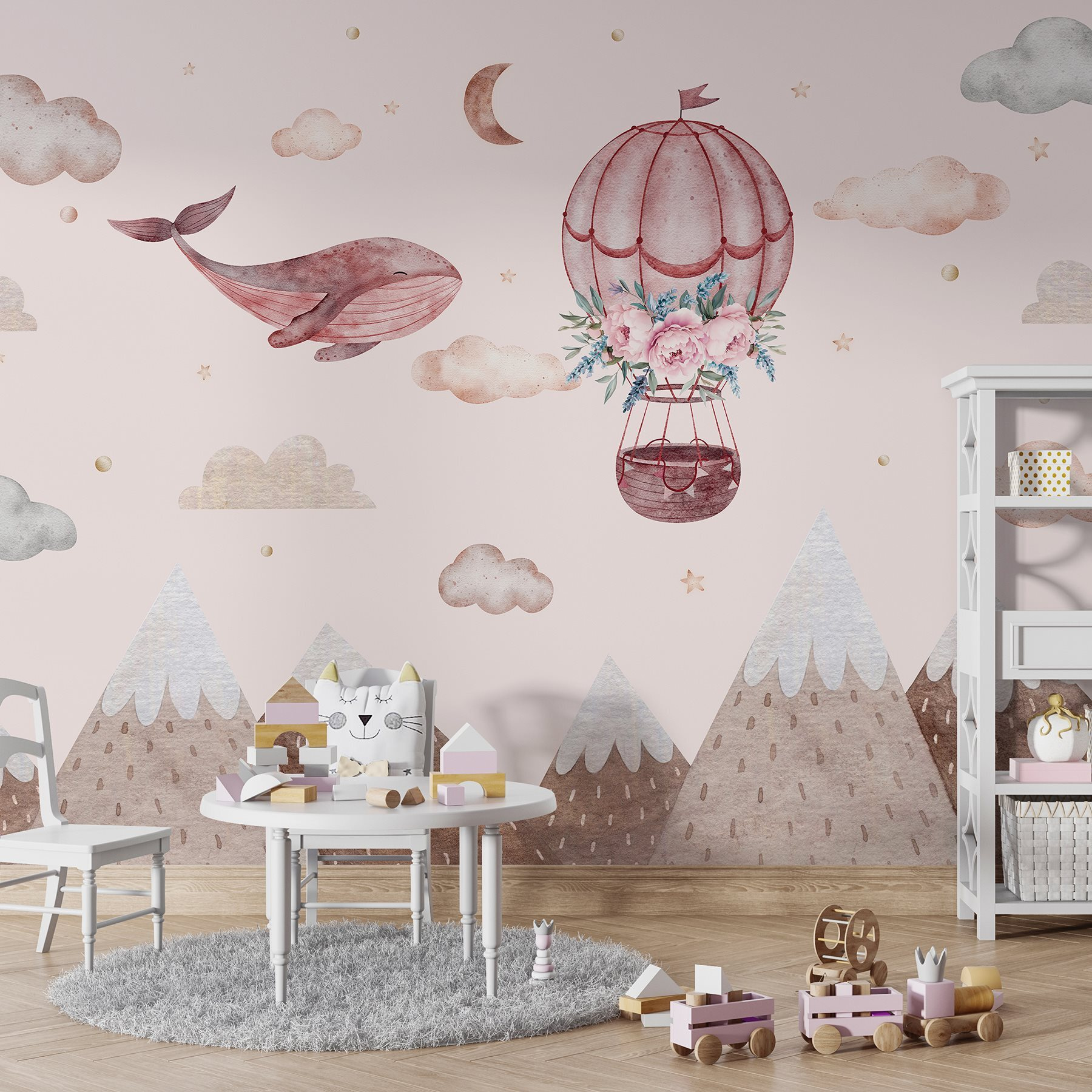 Immaginate un mondo stravagante in cui le balene planano nel cielo: è proprio quello che accade con questo murale! Caratterizzato da un’incantevole mongolfiera ornata da delicati fiori, è una scena deliziosa che accende l’immaginazione. Immaginate di trasformare la stanza di un bambino o un accogliente angolo di lettura in una fuga da sogno. I colori tenui e le dolci montagne creano un’atmosfera serena, perfetta per rilassarsi con un buon libro o per sognare ad occhi aperti. È come una piccola avventura direttamente sulla parete: chi non vorrebbe salpare tra le nuvole con una simpatica balena? Appendetelo e lasciate che la magia si compia!