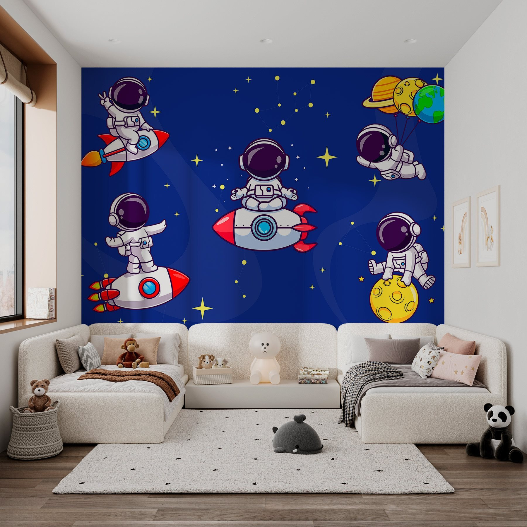 Esplodete in una galassia di divertimento con questo stravagante murale con astronauti dei cartoni animati che fluttuano nello spazio. Immaginate di entrare in una stanza dove i piccoli esploratori sventolano dai razzi, si rilassano sulla luna e affrontano il cosmo con stile. Perfetto per la cameretta di un bambino o per un salotto giocoso, questo murale invita a sognare avventure interstellari e notti stellate. È come un biglietto per l’universo senza lasciare il divano. Che si tratti dell’ora della favola o di una serata intima, questo murale trasforma le pareti in una piattaforma di lancio per l’immaginazione e la gioia. Chi non vorrebbe andare alla deriva tra le stelle?