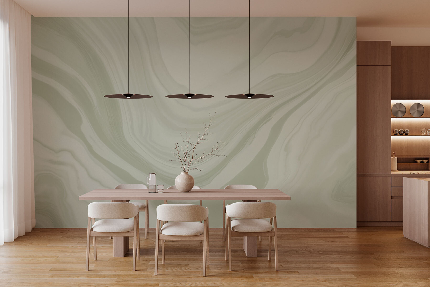Guardate esattamente come apparirà il vostro spazio con la nuova carta da parati prima di acquistarla. Visualizzazione professionale da parte di designer esperti senza alcun costo o obbligo di acquisto.