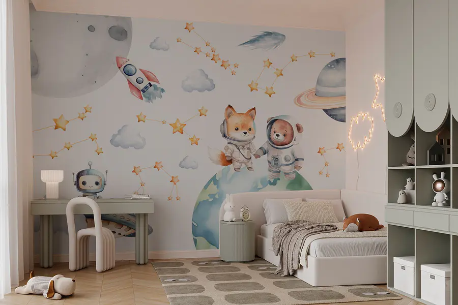 Trasformate qualsiasi stanza in un paese delle meraviglie cosmico con questo delizioso murale con animali acquerellati nello spazio. Immaginate un angolo accogliente dove una volpe e un orso, vestiti con tute da astronauta, esplorano insieme l’universo. Mentre fluttuano tra pianeti pastello e stelle scintillanti, è come se vi invitassero a unirvi alla loro avventura interstellare. Perfetto per i bambini o per i più giovani, questo murale aggiunge un tocco stravagante che stimola l’immaginazione. Immaginate la gioia di accoccolarvi con un libro sotto questo allegro cosmo. È un dolce promemoria del fatto che la meraviglia è ovunque, anche a casa vostra. Il vostro spazio potrebbe essere il prossimo grande hub per gli esploratori galattici o semplicemente un luogo accogliente per coccole e sogni ad occhi aperti.