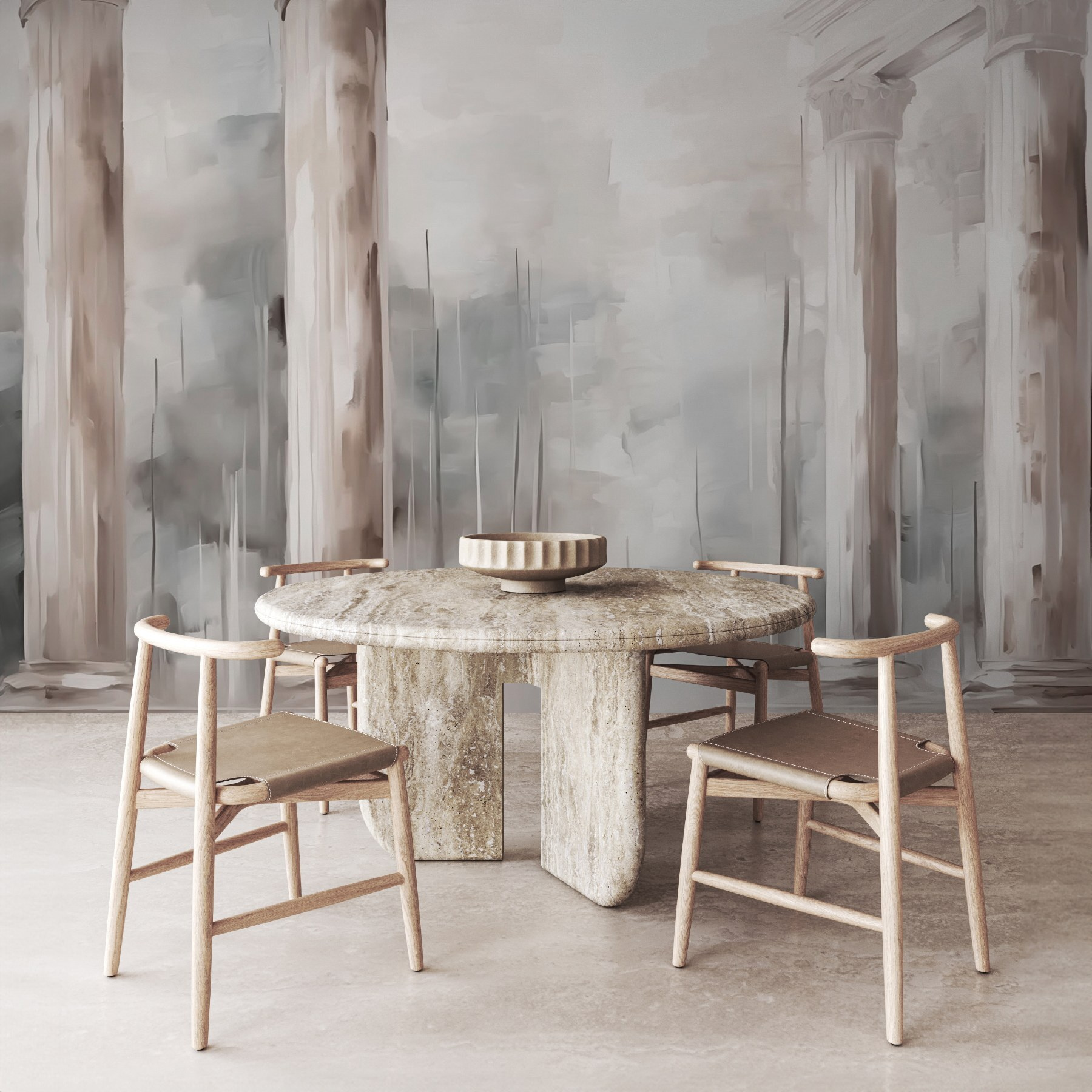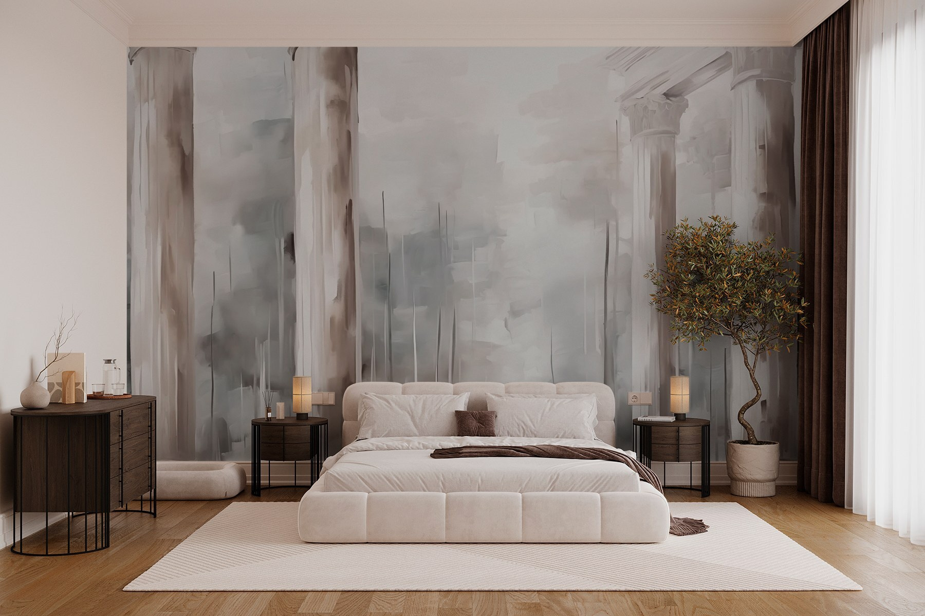 Trasformare uno spazio può essere semplice come aggiungere un murale, e questo è un vero spettacolo. Immaginate di entrare in una stanza dove grandi colonne si protendono verso il cielo, invitandovi in un mondo sereno. Le tonalità morbide e sognanti creano uno sfondo rilassante, perfetto per sorseggiare un caffè o immergersi in un buon libro. È come avere un piccolo pezzo di architettura classica proprio sulle vostre pareti. Gli amici verranno a trovarvi, ammireranno il murale e si chiederanno se siete diventati segretamente degli intenditori d’arte. Chi ha bisogno di gallerie d’arte di lusso quando questa bellezza può far sognare ad occhi aperti nel vostro salotto?