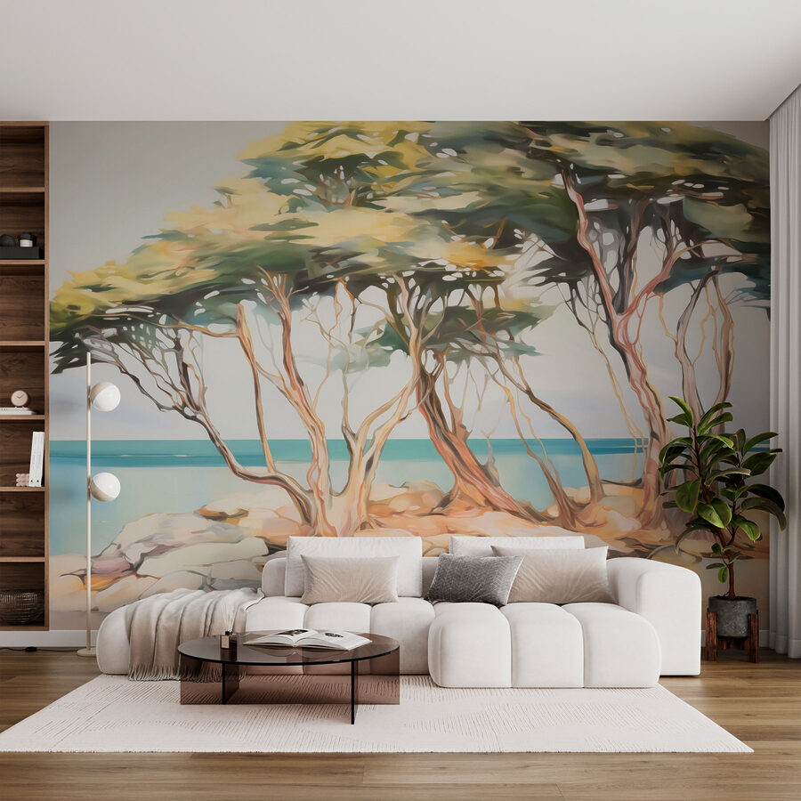 Immaginate di entrare in una stanza e di sentirvi immediatamente come se aveste passeggiato su un’accogliente isola rocciosa: è perfetto? Questo murale mostra un affascinante gruppo di alberi sulla riva del mare, che sussurrano storie di dolci brezze e onde oceaniche. Le morbide vibrazioni dell’acquerello aggiungono un tocco di estrosità e di sogno a cui è difficile resistere. Immaginatelo in un salotto o in una tranquilla camera da letto, dove invita a sognare ad occhi aperti e a trascorrere pomeriggi pigri. È come una mini-vacanza sulla parete, che ricorda a tutti di rallentare e immergersi nella bellezza. Chi non vorrebbe una fuga del genere ogni giorno?