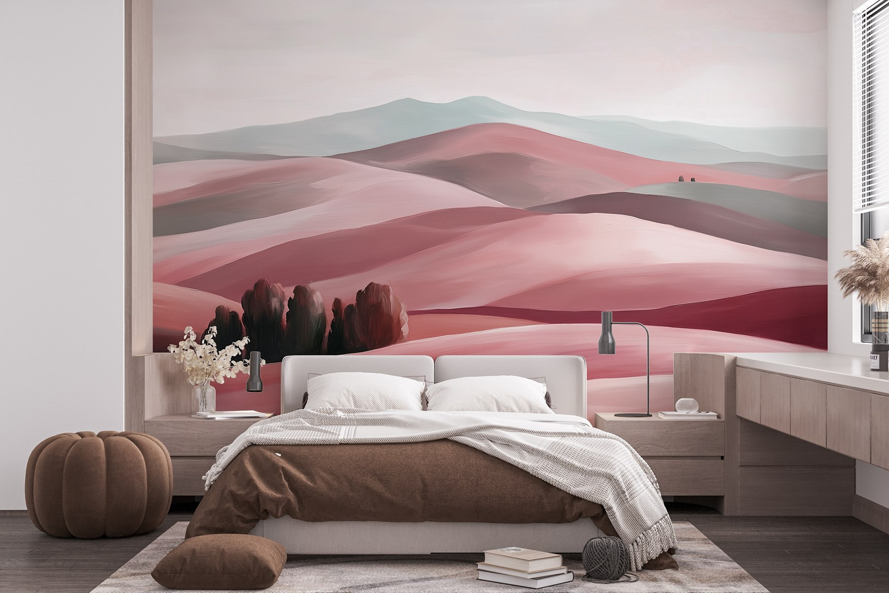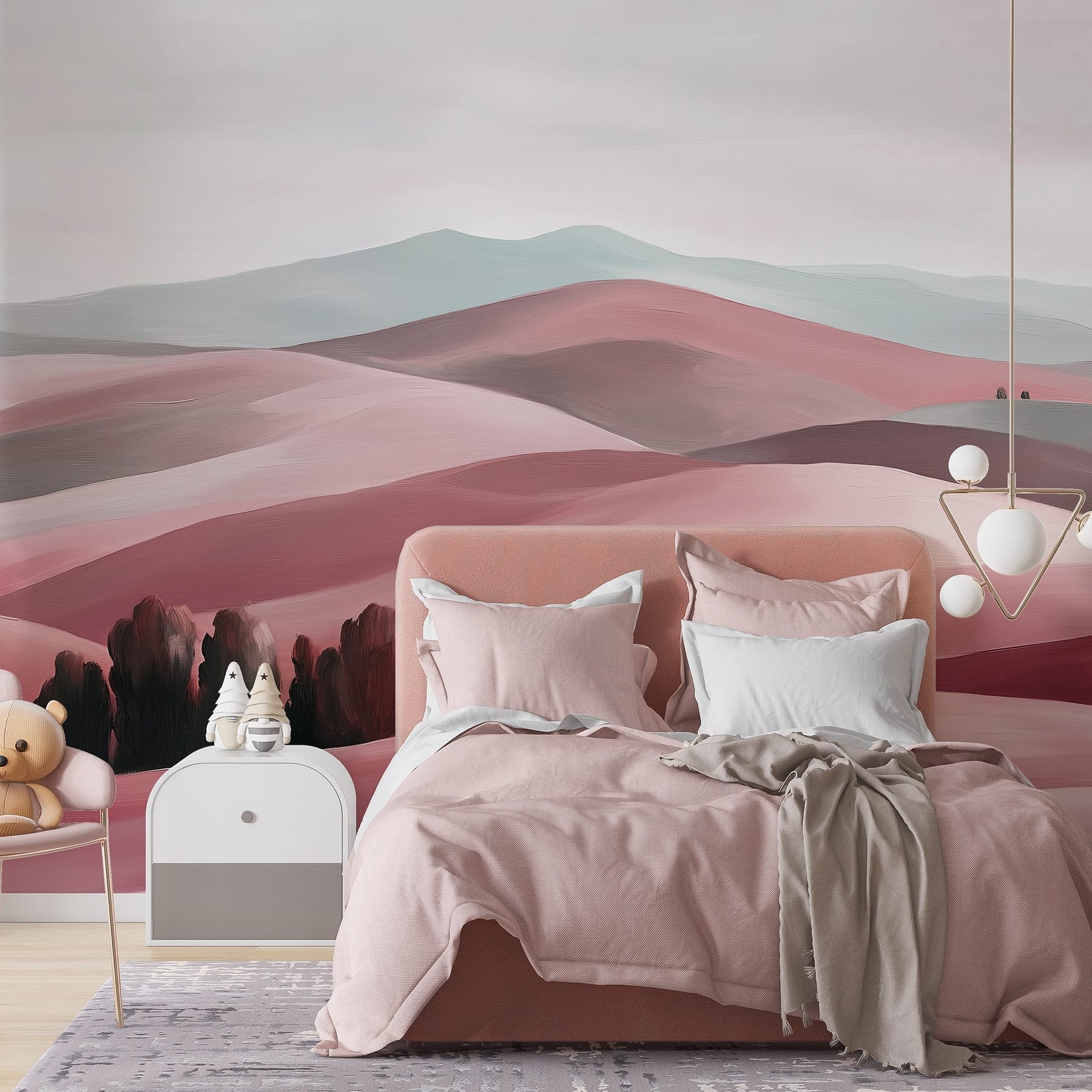 Trasformate una parete semplice in una fuga da sogno con il murale “Paesaggio di colline con alberi”. Immaginate di entrare in una stanza che sembra immediatamente un rifugio sereno, dove dolci colline rotolano sotto un cielo morbido. I toni delicati del rosa e del grigio invitano alla calma e al calore, perfetti per chiacchierare o sognare con una tazza di tè.