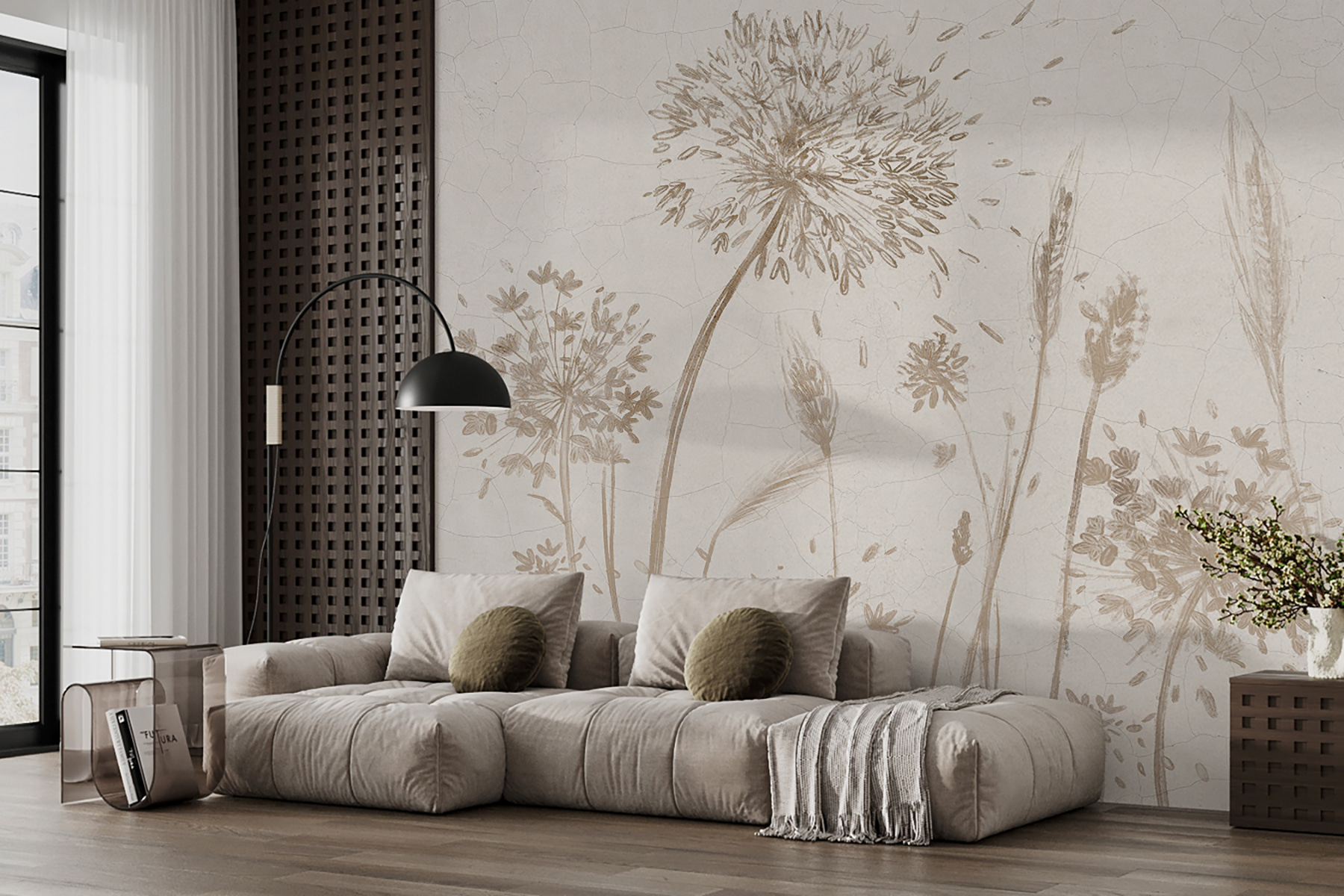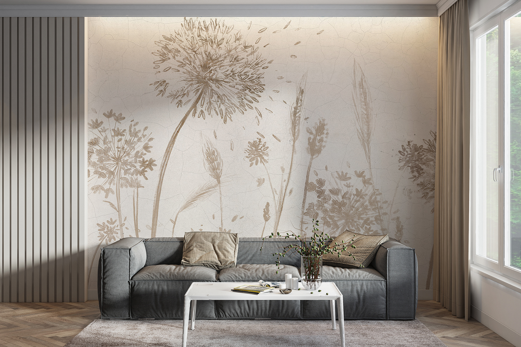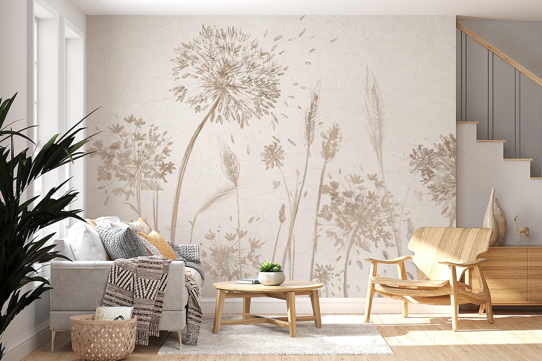 Immaginate di portare la calma e la bellezza della natura direttamente nella vostra stanza. Questo è ciò che fa “Carta da parati w07921”: è come una boccata d’aria fresca per le vostre pareti. Immaginate delicati fiori di campo e leggiadri denti di leone, tratteggiati in dolci tonalità di marrone e beige, che ondeggiano come in una brezza estiva. Le crepe sullo sfondo conferiscono un fascino rustico e vintage, come se fosse stato baciato dal tempo…