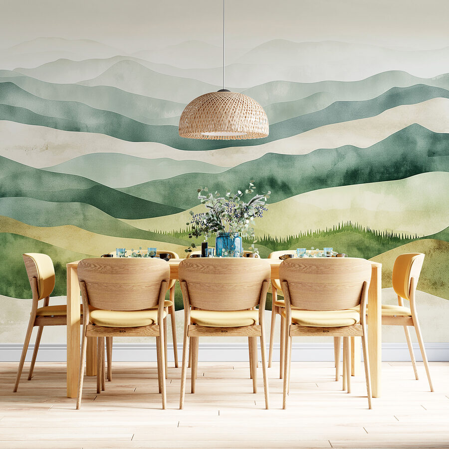 Immaginate di avere questo splendido murale ad acquerello, giustamente chiamato “Murales w07950”, sulla vostra parete: è come portare la serena bellezza della natura in casa! Questo murale, inserito nelle categorie “Murales popolari” e “Murales natura”, è una delizia anche per gli appassionati di arte ad acquerello. Strati di colline nebbiose rotolano dolcemente sulla tela, mescolando sfumature di verde e beige delicato in un modo che rasserena l’anima.