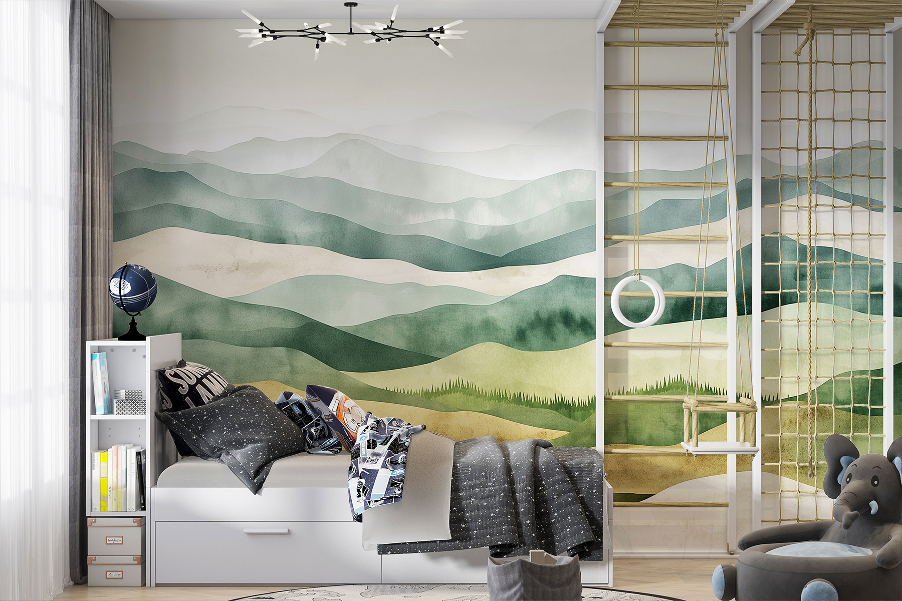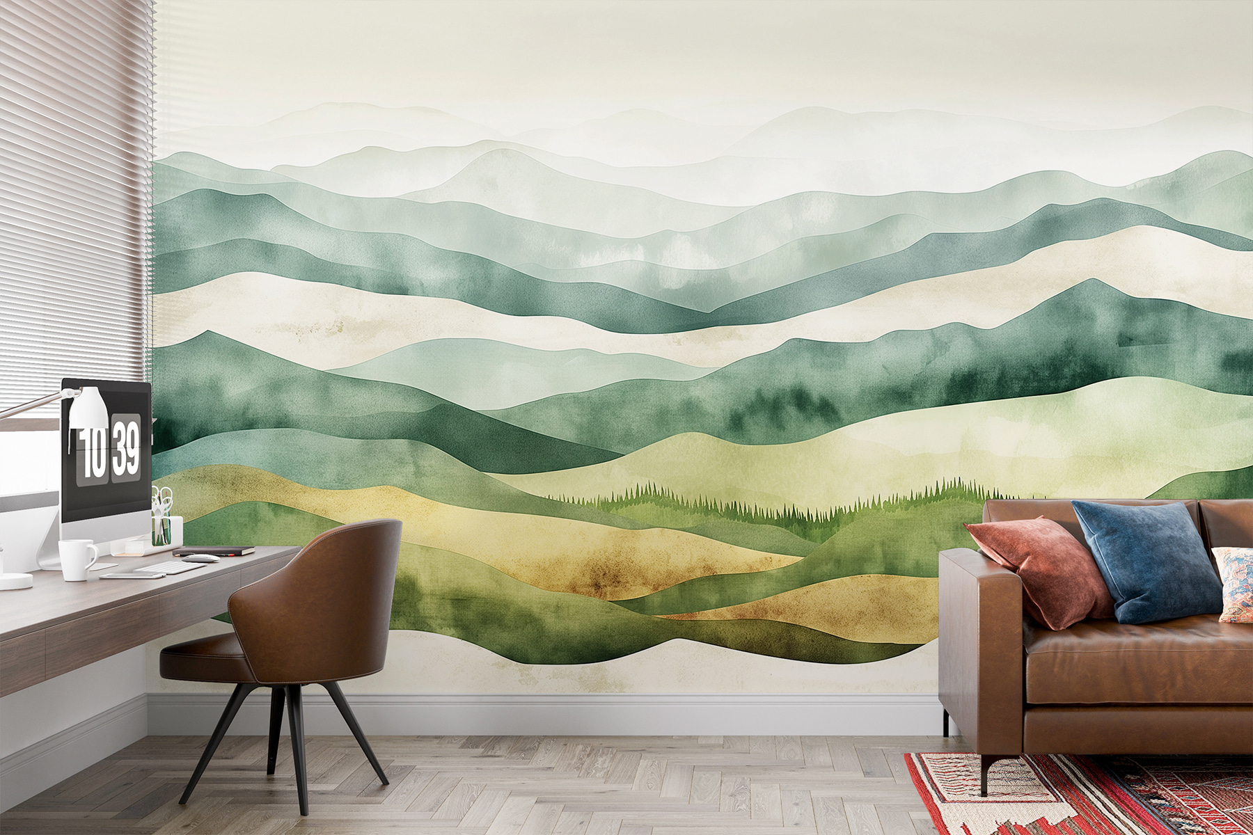 Immaginate di avere questo splendido murale ad acquerello, giustamente chiamato “Murales w07950”, sulla vostra parete: è come portare la serena bellezza della natura in casa! Questo murale, inserito nelle categorie “Murales popolari” e “Murales natura”, è una delizia anche per gli appassionati di arte ad acquerello. Strati di colline nebbiose rotolano dolcemente sulla tela, mescolando sfumature di verde e beige delicato in un modo che rasserena l’anima.