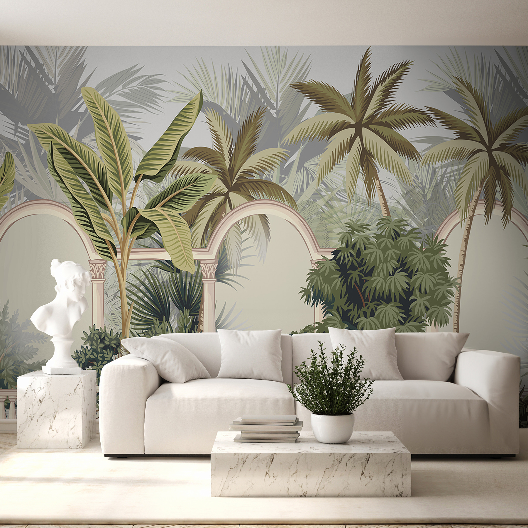 Immaginate di entrare nella vostra stanza e di sentirvi come in una serena oasi tropicale. Questo murale, con le sue graziose palme che ondeggiano dolcemente contro eleganti archi, crea questa atmosfera senza sforzo. È come una piccola fuga, una finestra su una giungla lussureggiante senza uscire di casa. Perfetto per aggiungere un tocco di natura e un pizzico di avventura al vostro spazio. Chi avrebbe mai detto che una parete potesse essere il biglietto per il paradiso? Aggiungete delle comode sedute e potreste ritrovarvi a sognare ad occhi aperti la brezza dell’isola.