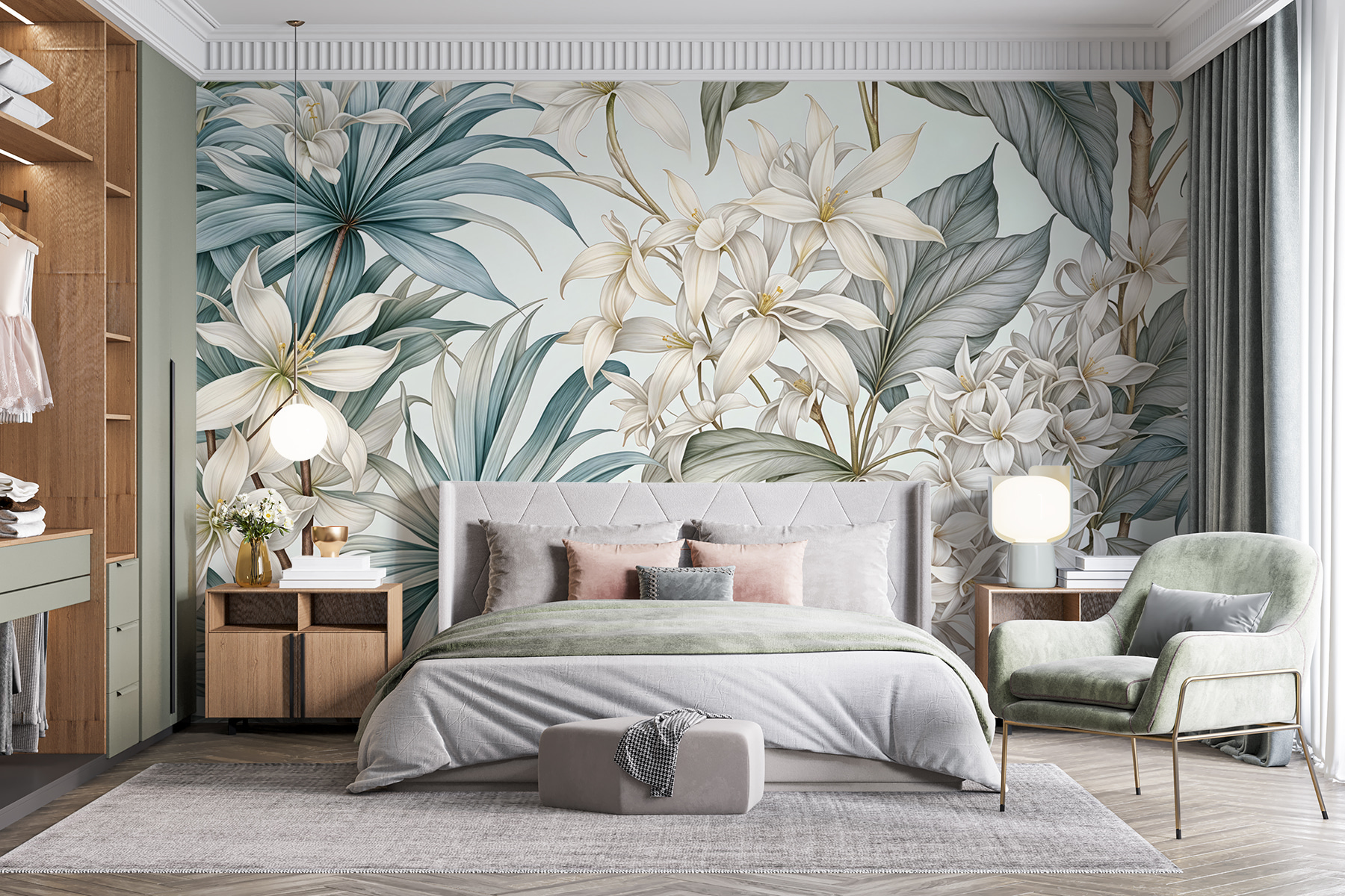 Guardate esattamente come apparirà il vostro spazio con la nuova carta da parati prima di acquistarla. Visualizzazione professionale da parte di designer esperti senza alcun costo o obbligo di acquisto.