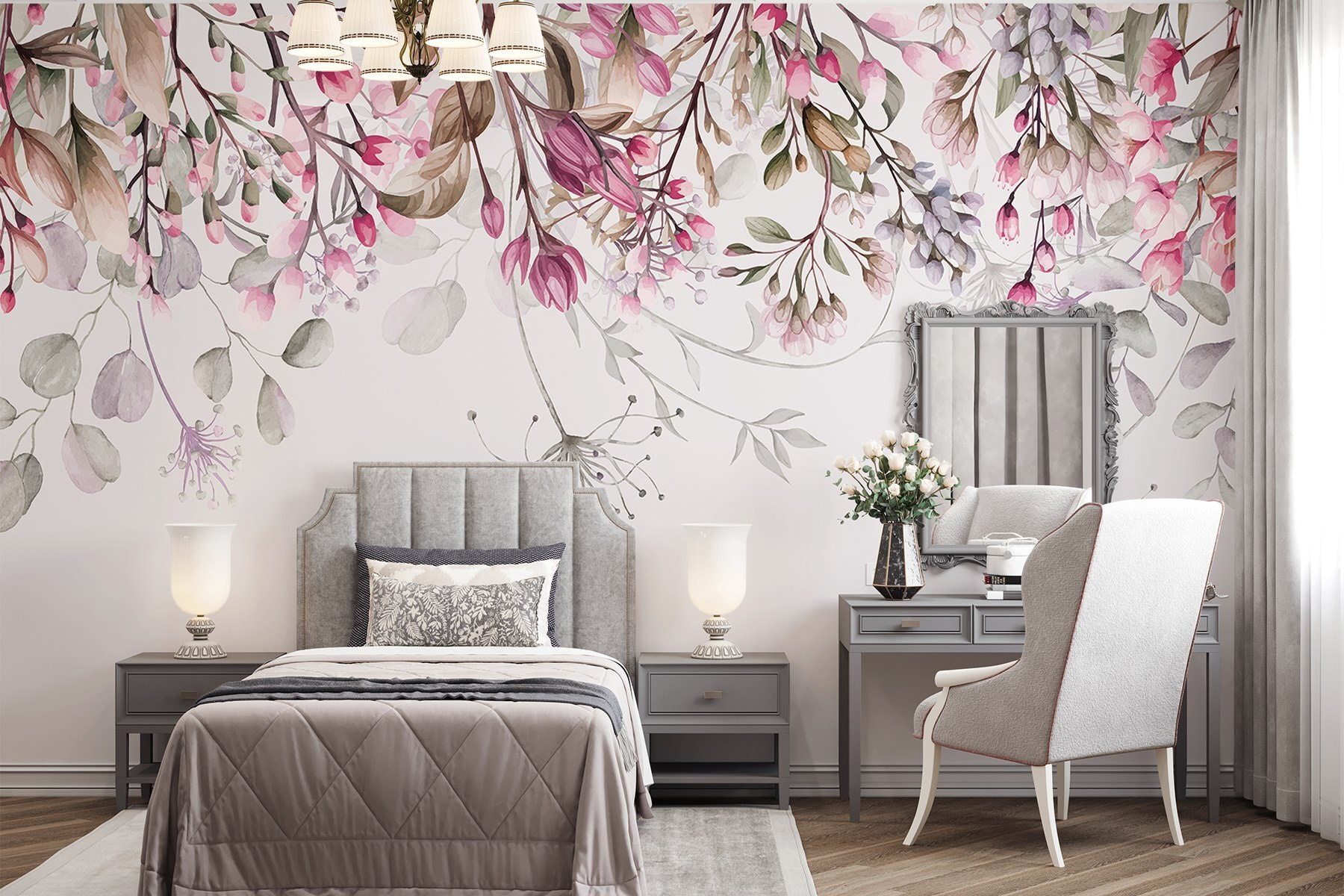 Guardate esattamente come apparirà il vostro spazio con la nuova carta da parati prima di acquistarla. Visualizzazione professionale da parte di designer esperti senza alcun costo o obbligo di acquisto.