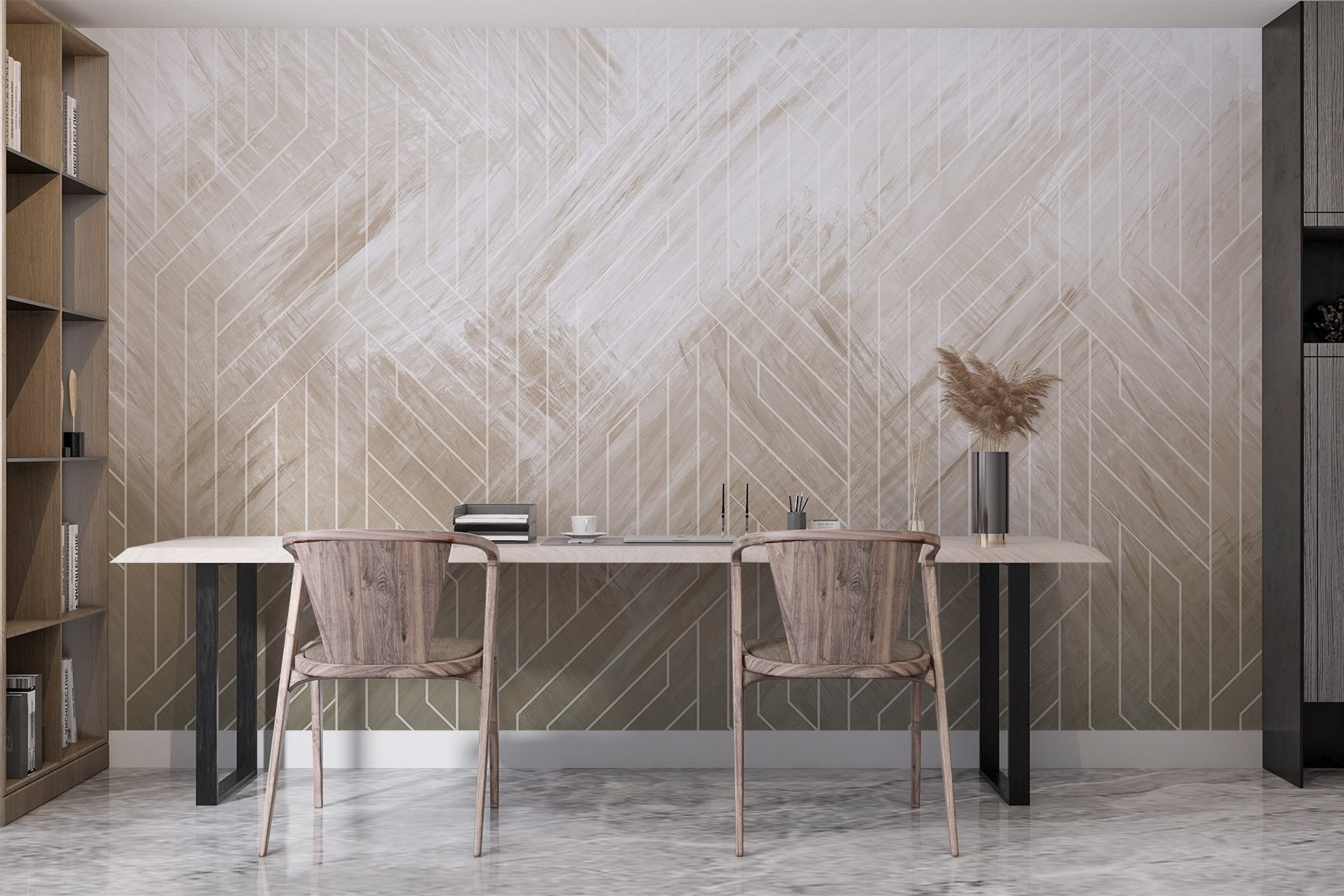 Guardate esattamente come apparirà il vostro spazio con la nuova carta da parati prima di acquistarla. Visualizzazione professionale da parte di designer esperti senza alcun costo o obbligo di acquisto.