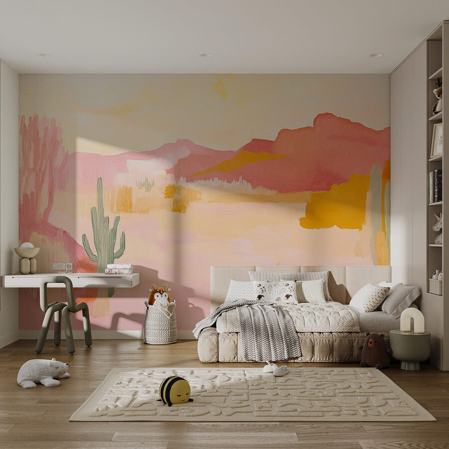 Immaginate di trasformare la vostra stanza in una serena oasi nel deserto con questo splendido murale. Raffigurante un paesaggio da sogno immerso in calde tonalità di rosa e gialli tenui, invita a vibrazioni rilassanti che vi faranno sentire come se steste vagando in un deserto illuminato dal sole al tramonto. Immaginate un angolo accogliente dove sorseggiare il vostro caffè, sognando viaggi spontanei in macchina. I cactus giocosi e le colline ondulate portano vita e calore, trasformando le pareti in una tela con la bellezza della natura. È come avere una finestra sulla natura selvaggia proprio a casa vostra, senza la sabbia nelle scarpe! Perfetto per chi desidera un tocco di tranquillità nel proprio spazio.