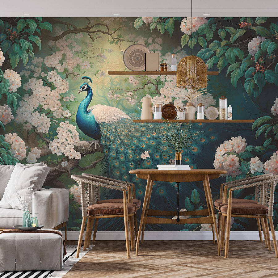 Trasformate il vostro spazio con questo splendido murale che raffigura un pavone appollaiato con grazia su un ramo d’albero, circondato da delicate fioriture. È come invitare una fetta di natura a casa vostra! Immaginate di svegliarvi ogni mattina con colori così vivaci: quei blu e quei verdi sono semplicemente ipnotici. Inoltre, potreste sentirvi un po’ eleganti ad avere un uccello così maestoso come compagno di parete.